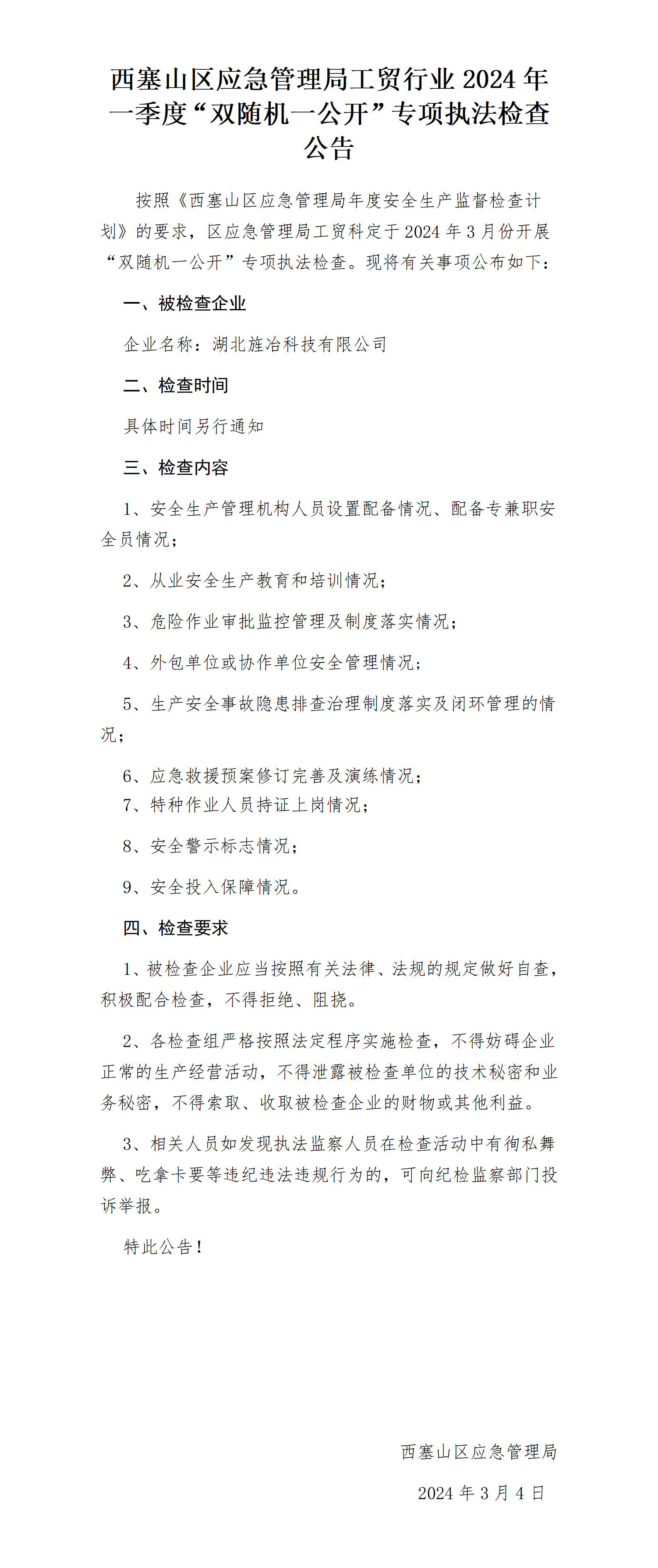 西塞山区应急管理局工贸行业2024年一季度“双随机、一公开”专项执法检查公告