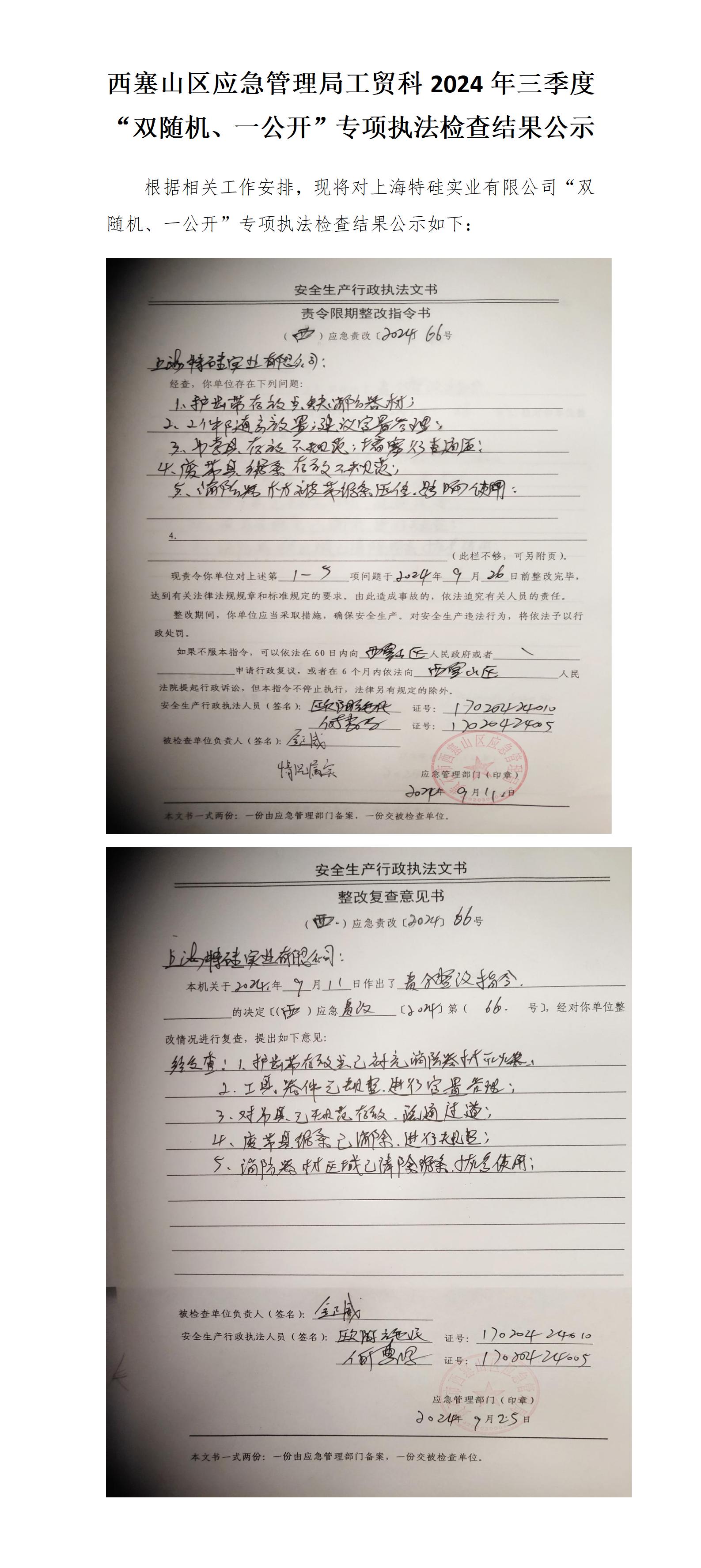 西塞山区应急管理局工贸科2024年三季度“双随机、一公开”专项执法检查结果公示