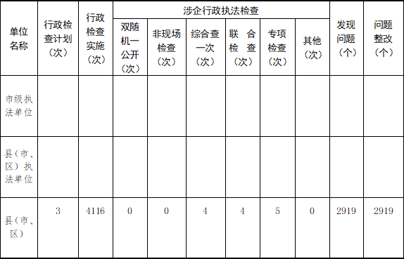 行政检查计划次数是具有行政检查权的行政执法主体拟定开展行政检查活动计划次数,行政检查实施是指具有行政检查权的行政执法主体实际组织开展的行政检查活动次数。“行政检查次数”的统计范围为统计年度1月1日至12月31日期间开展行政检查的次数;检查1个检查对象,有完整、详细检查记录的,计为检查1次;无特定检查对象的巡查、巡逻,无完整、详细检查记录,检查后作出行政处罚等其他行政执法行为的,均不计为检查次数。综合查一次侧重于检查频次,联合检查侧重于检查主体的多部门联合。