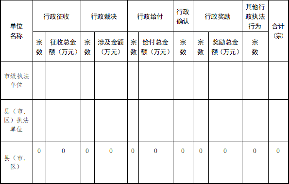 说明:市级行政执法单位填表格中的第1、2行数据,统计本单位和县(市、区)执法单位情况;县(市、区)司法局填表格中的第3行数据,汇总本级行政执法单位和乡镇(街道)情况。
