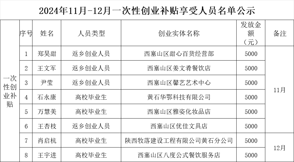 2024年11月-12月一次性创业补贴享受人员名单公示