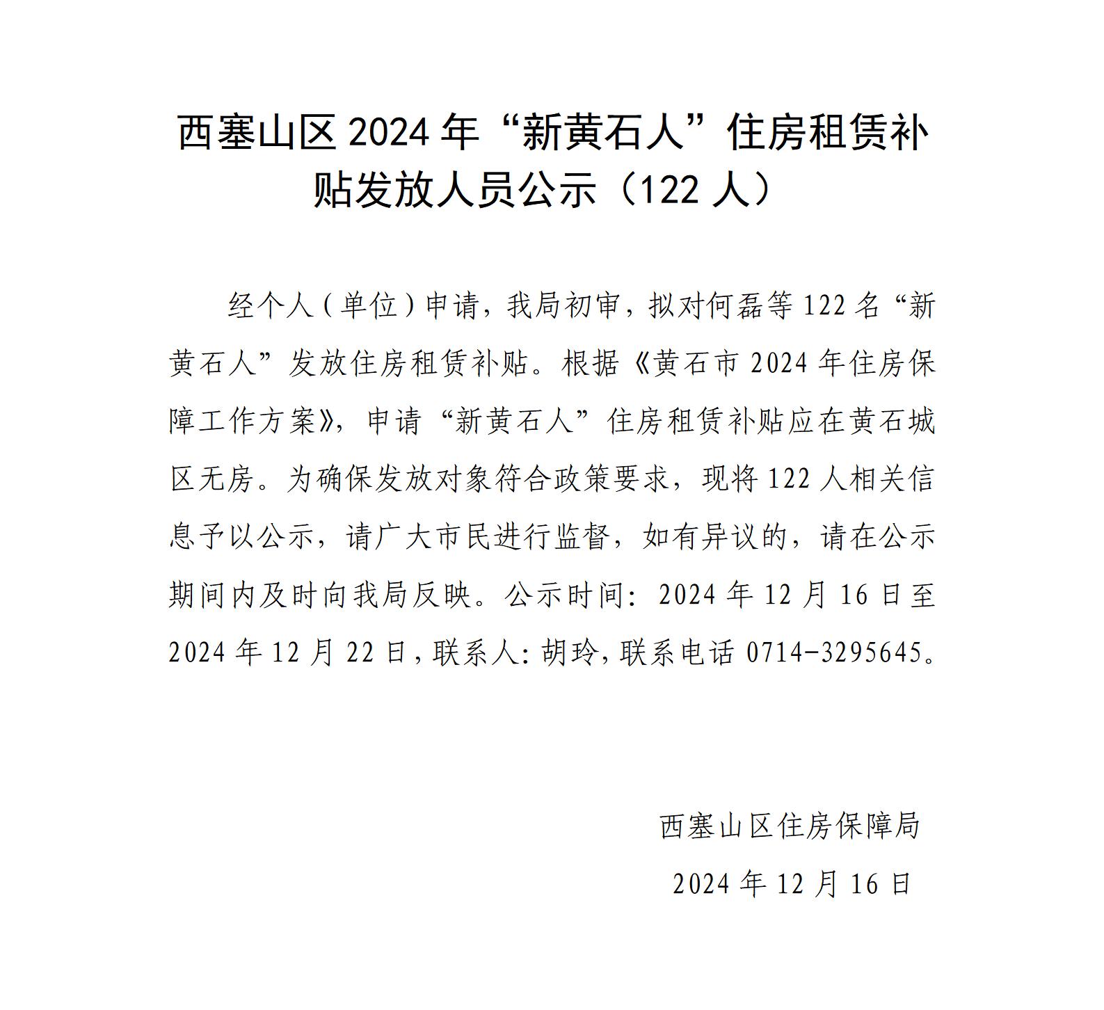 西塞山区2024年“新黄石人”住房租赁补贴发放人员公示(122人)