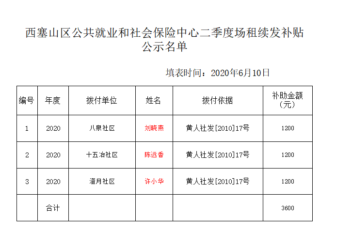西塞山区公共就业和社会保险中心二季度场租续发补贴公示名单