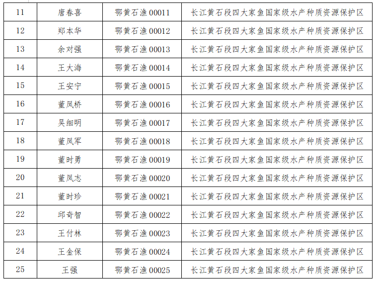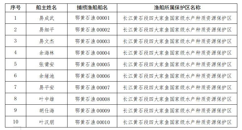 根据《长江段四大家鱼国家级水产种质资源保护区黄石城区江段全面禁捕工作实施方案》,我区对保护区内的37艘内陆渔业船舶证进行了回收,现将禁捕渔船注销公告如下: