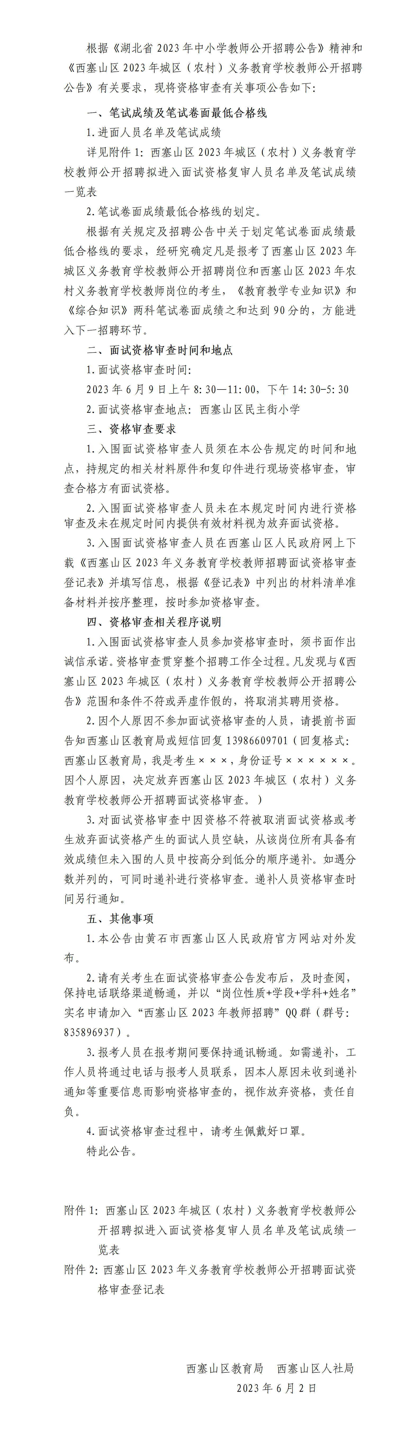 西塞山区2023年义务教育学校教师公开招聘面试资格审查公告