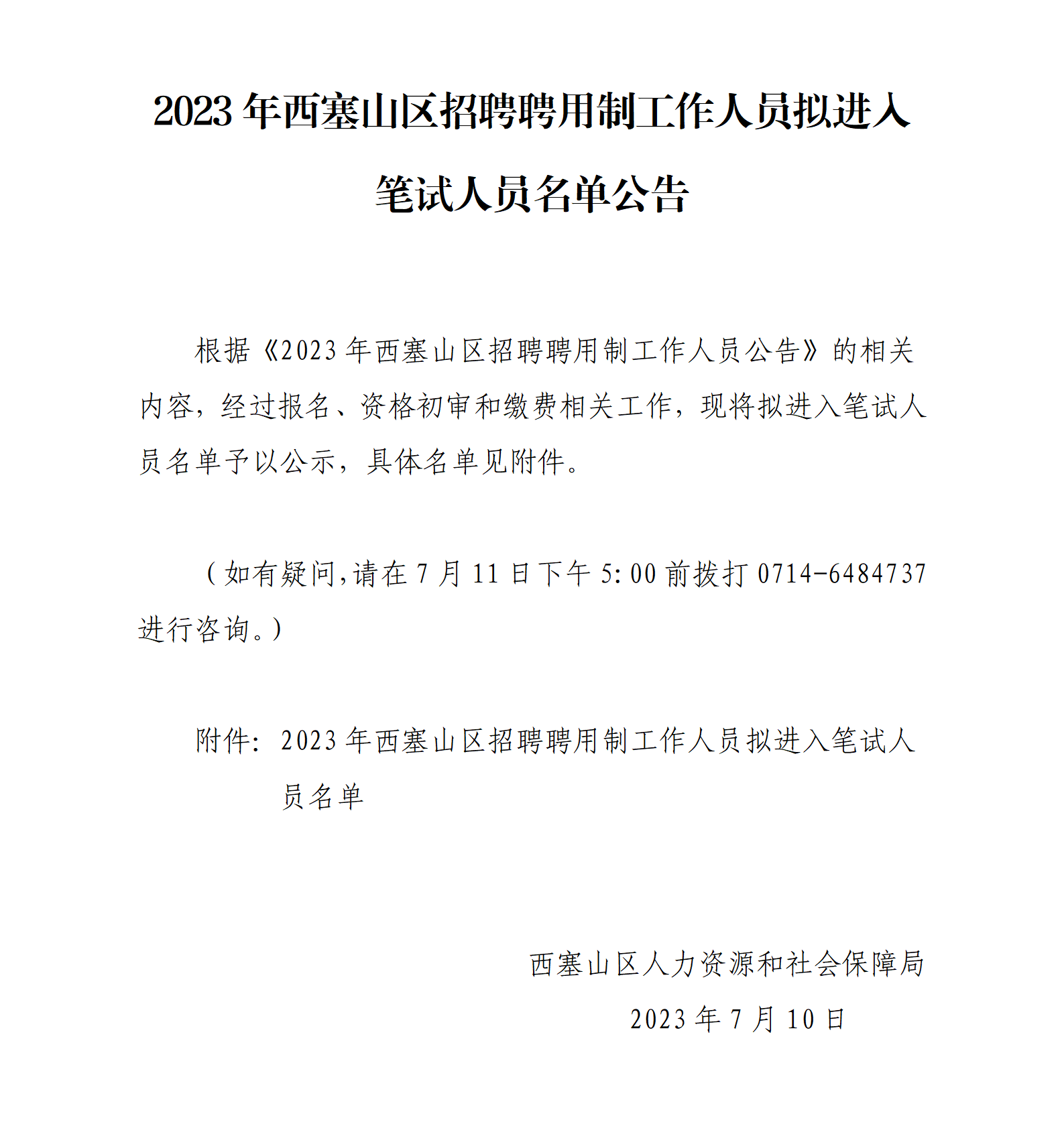 2023年西塞山区招聘聘用制工作人员拟进入笔试人员名单公告