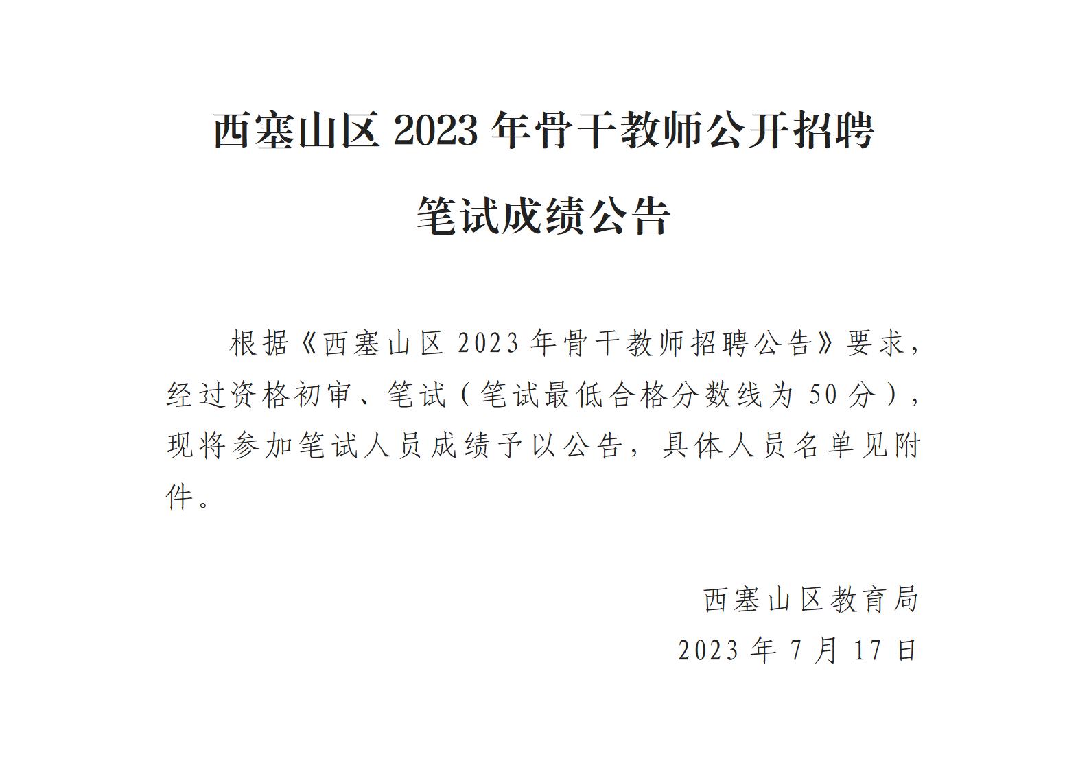 西塞山区2023年骨干教师公开招聘笔试成绩公告