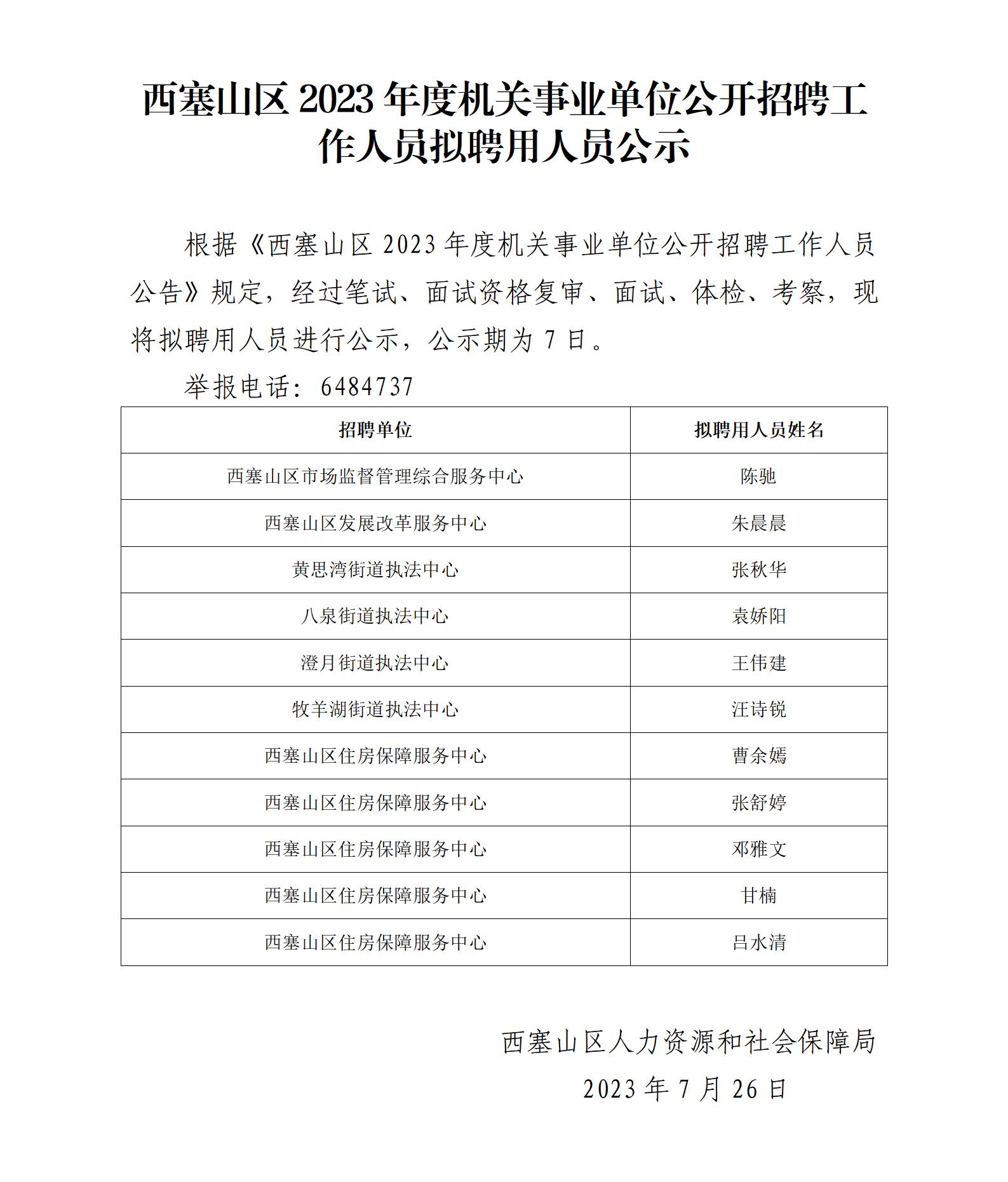 西塞山区2023年度机关事业单位公开招聘工作人员拟聘用人员公示