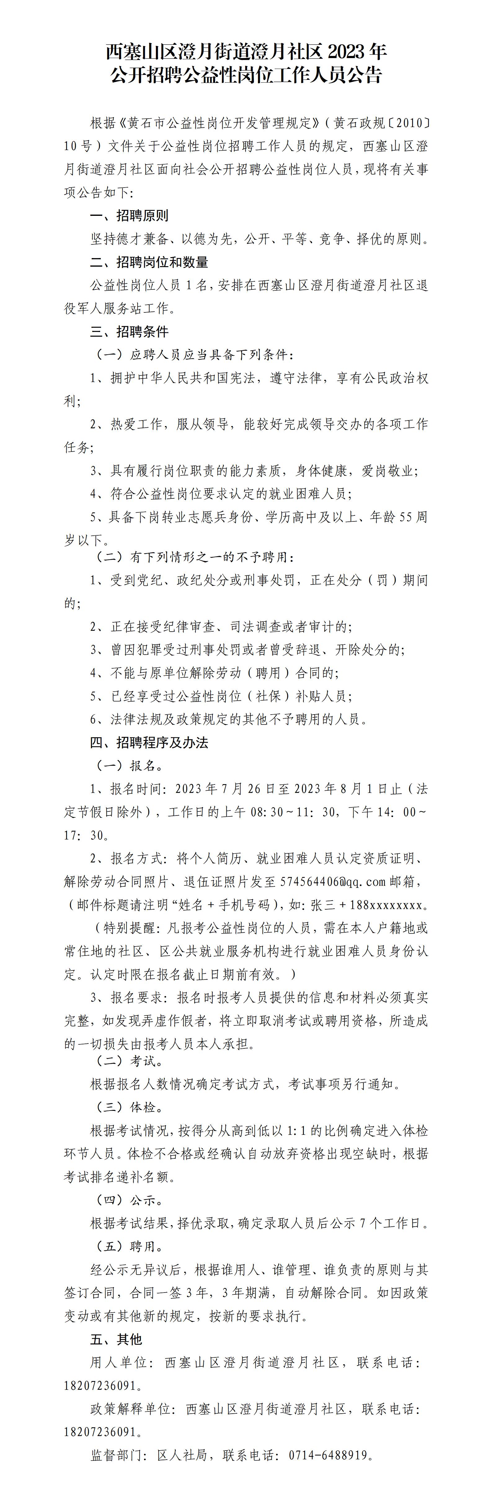 西塞山区澄月街道澄月社区2023年公开招聘公益性岗位工作人员公告