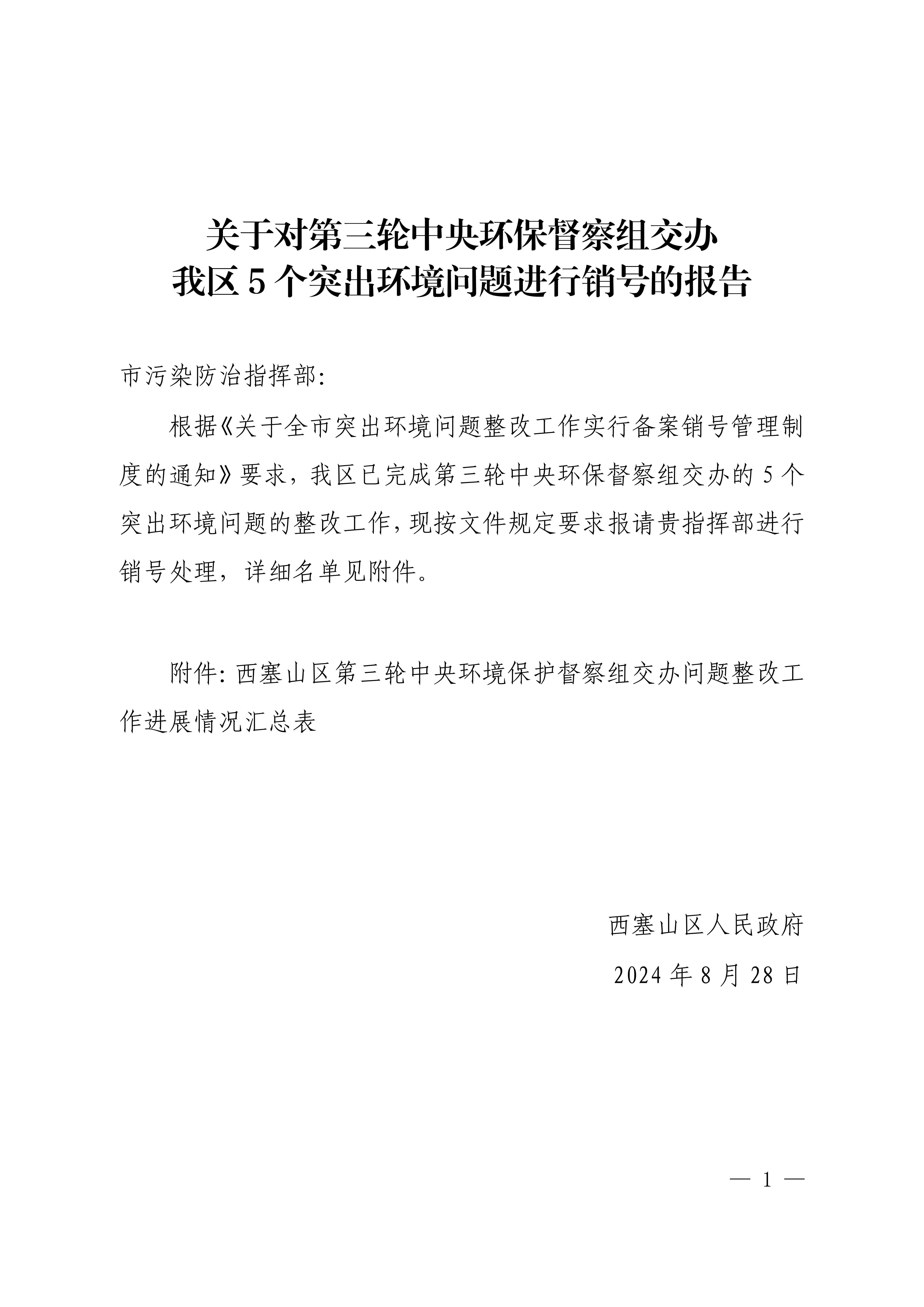 关于对第三轮中央环保督察组交办我区5个突出环境问题进行销号的报告