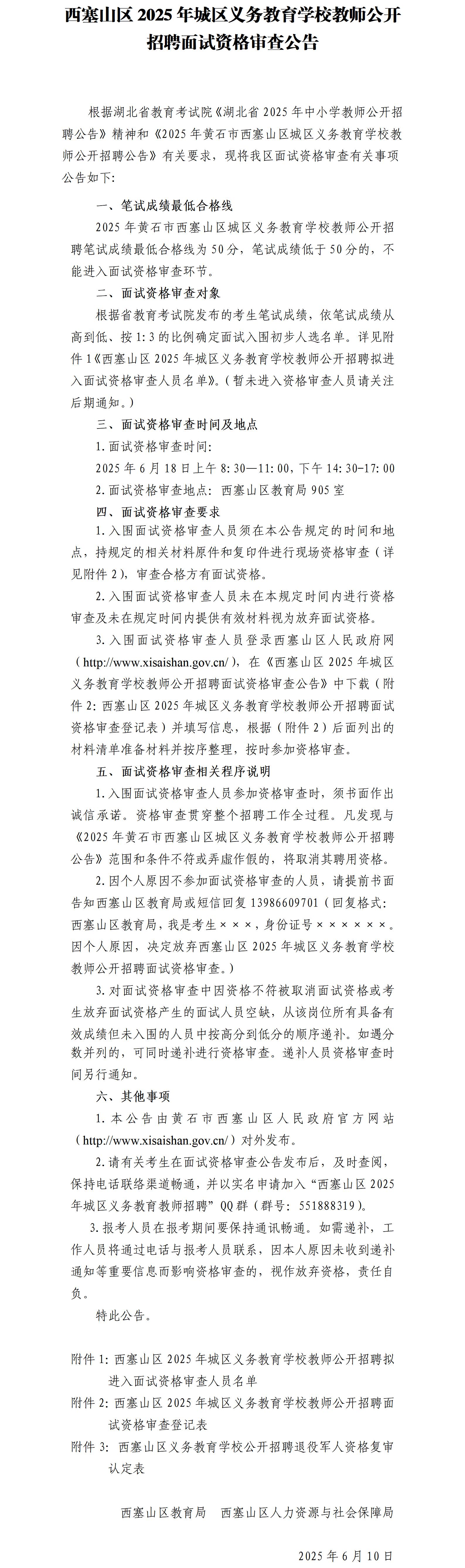 西塞山区2025年城区义务教育学校教师公开招聘面试资格审查公告