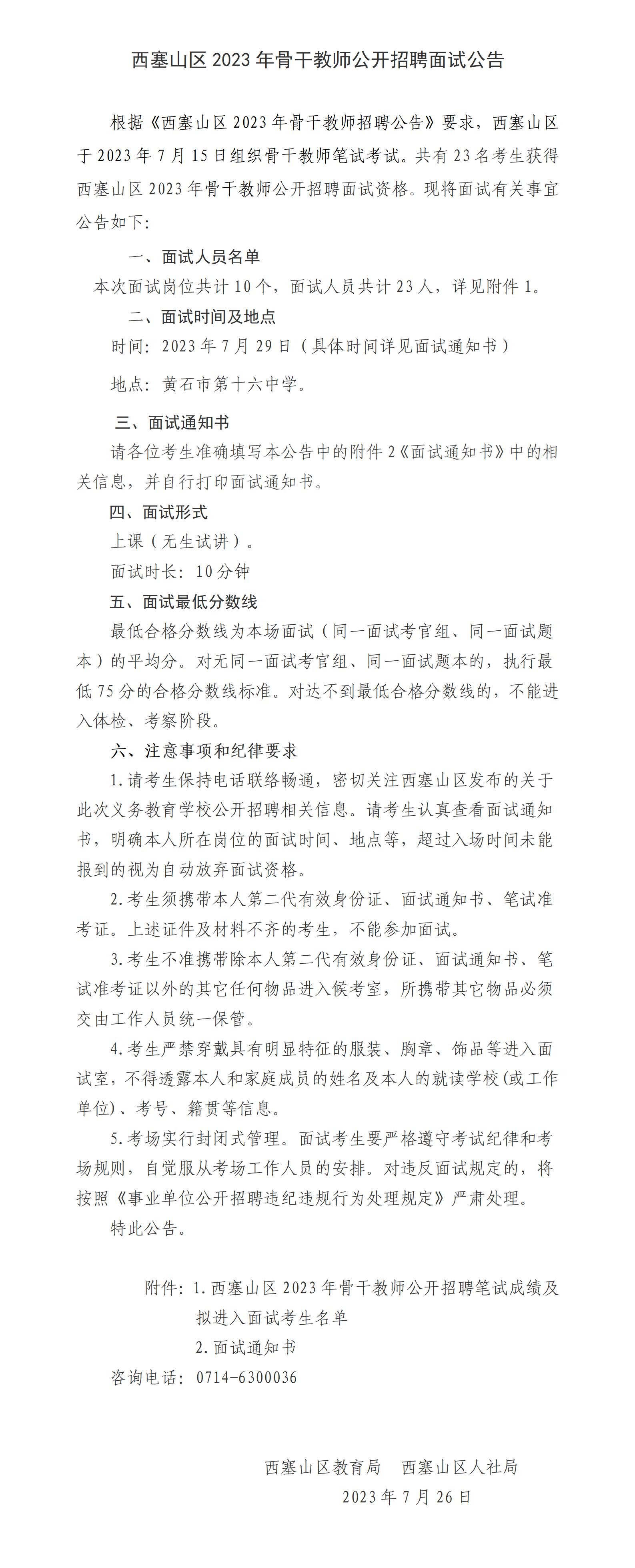 西塞山区2023年骨干教师公开招聘面试公告
