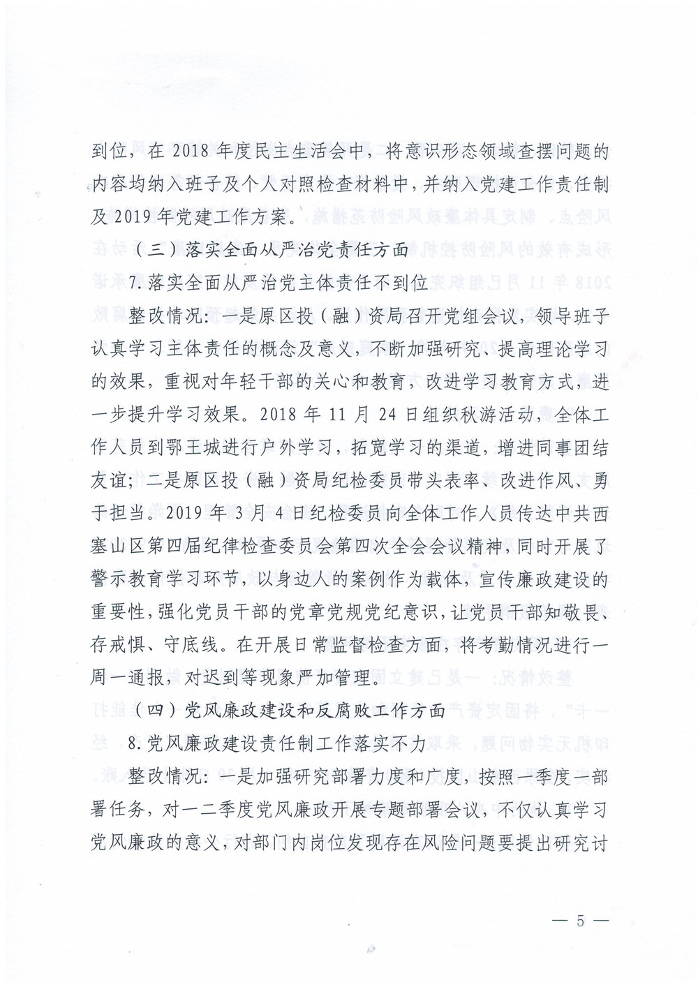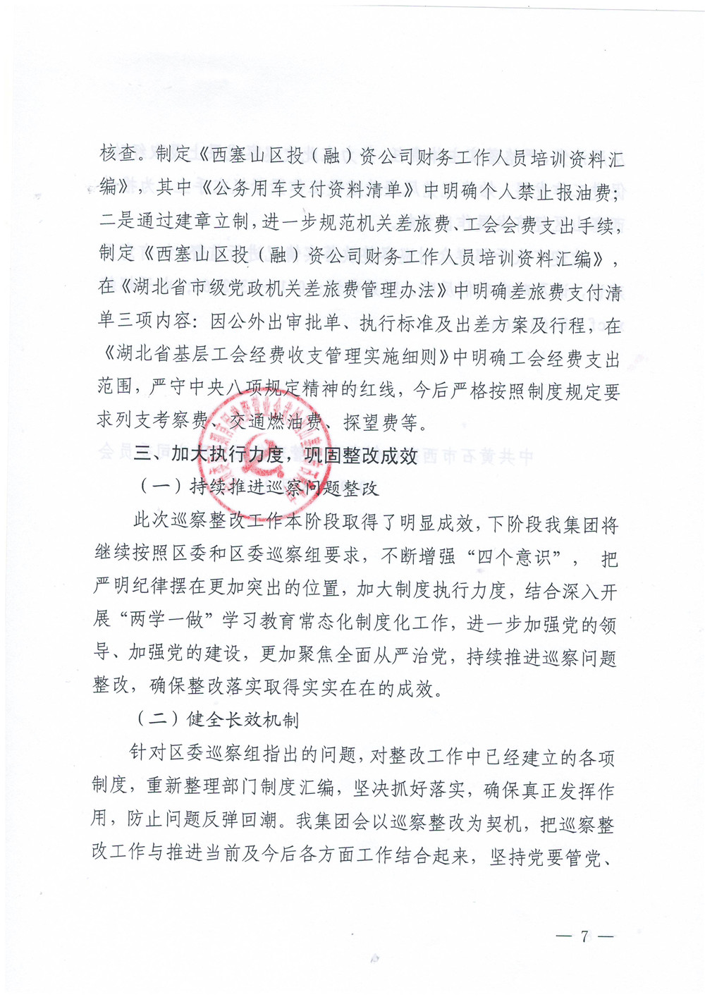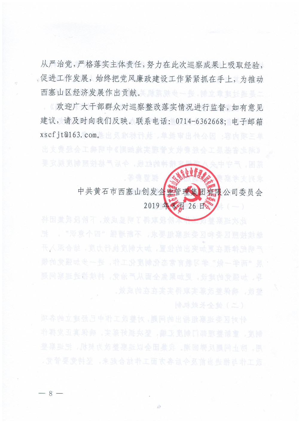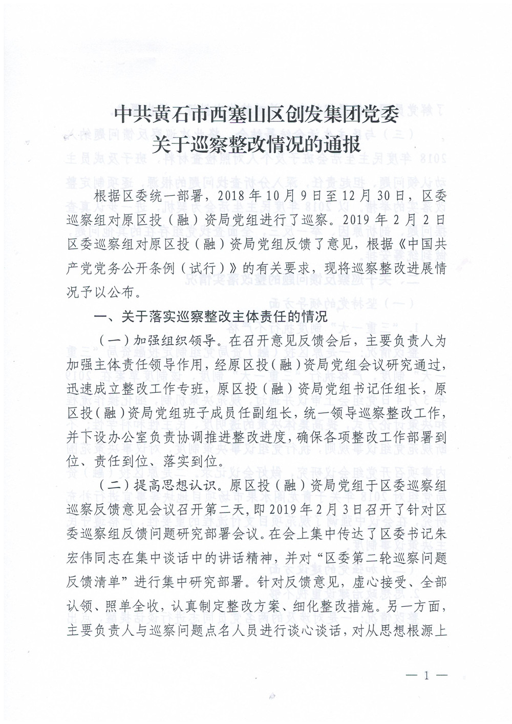 中共黄石市西塞山区创发集团党委关于巡察整改情况的通报