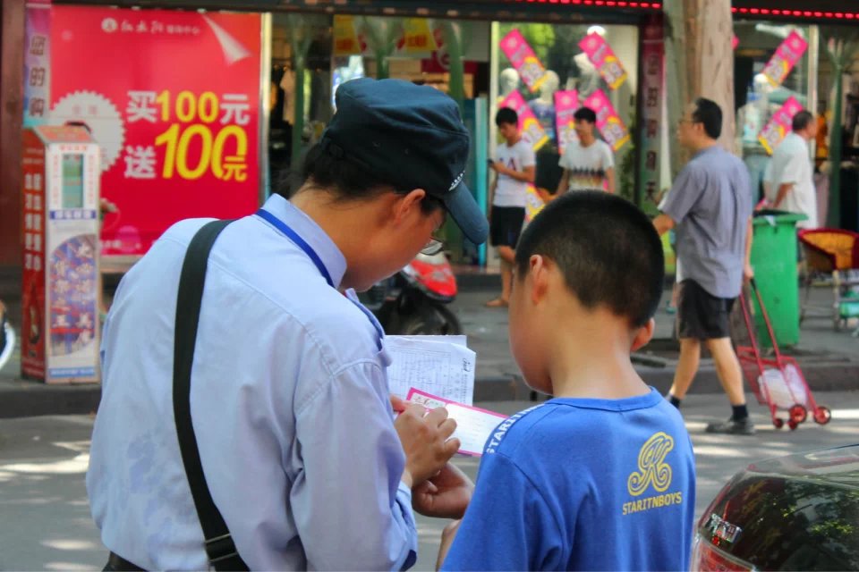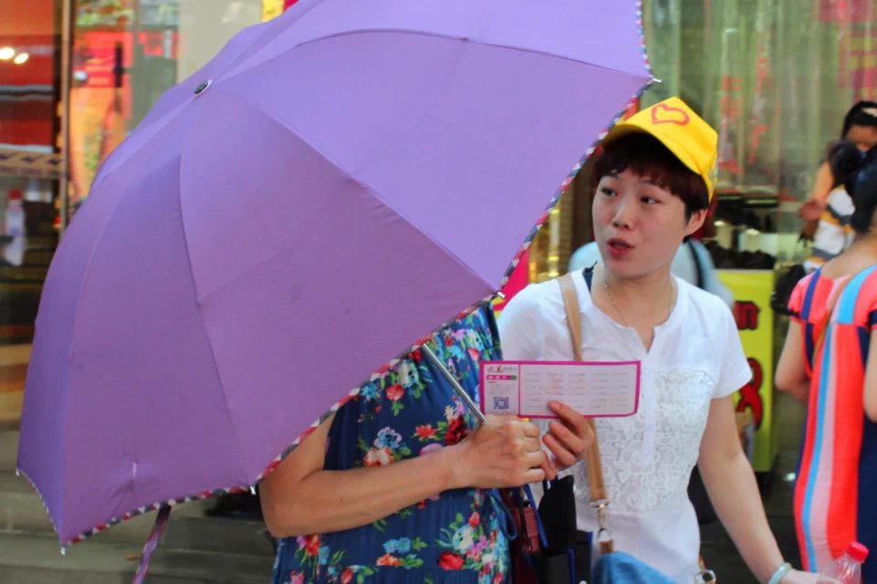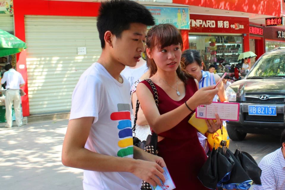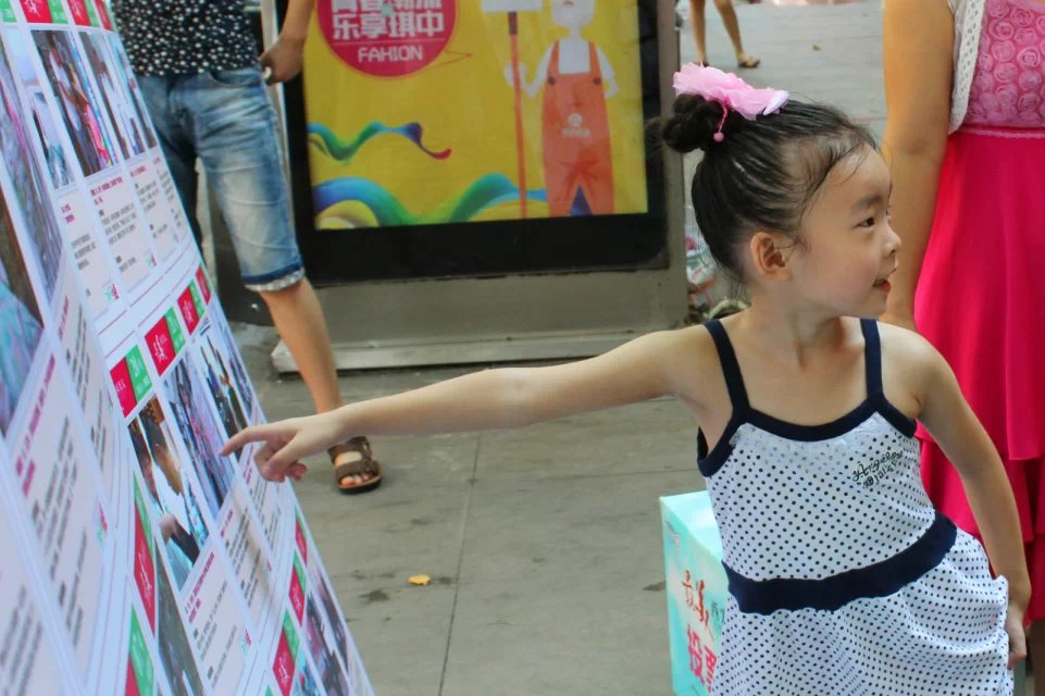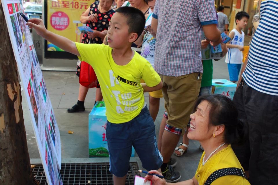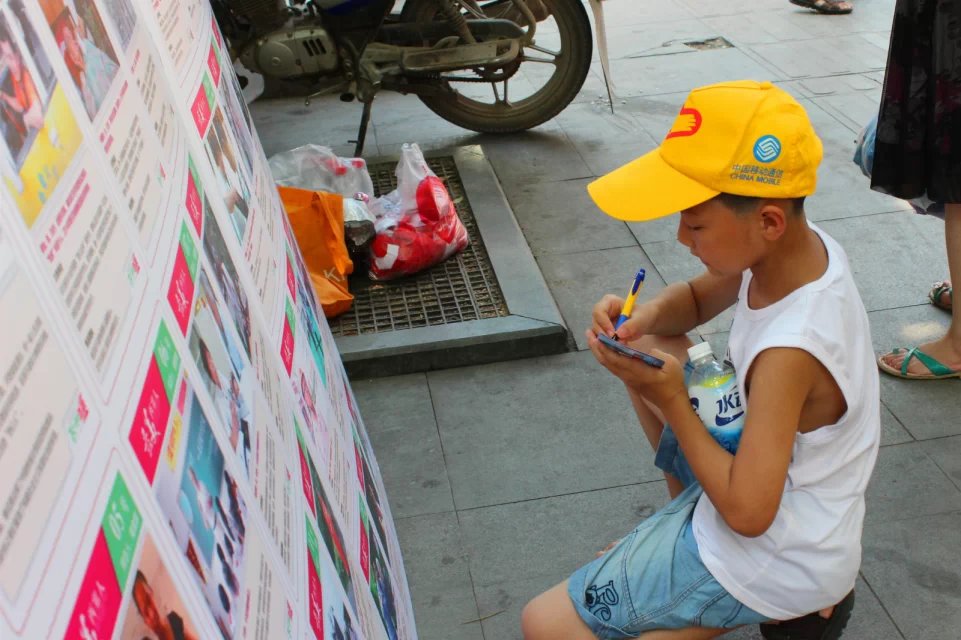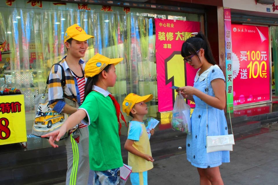 7月30日,一群头戴小黄帽的学生志愿者在黄石新华书店附近发放“最美西塞人”评选选票,动员市民关注“最美西塞人”活动。