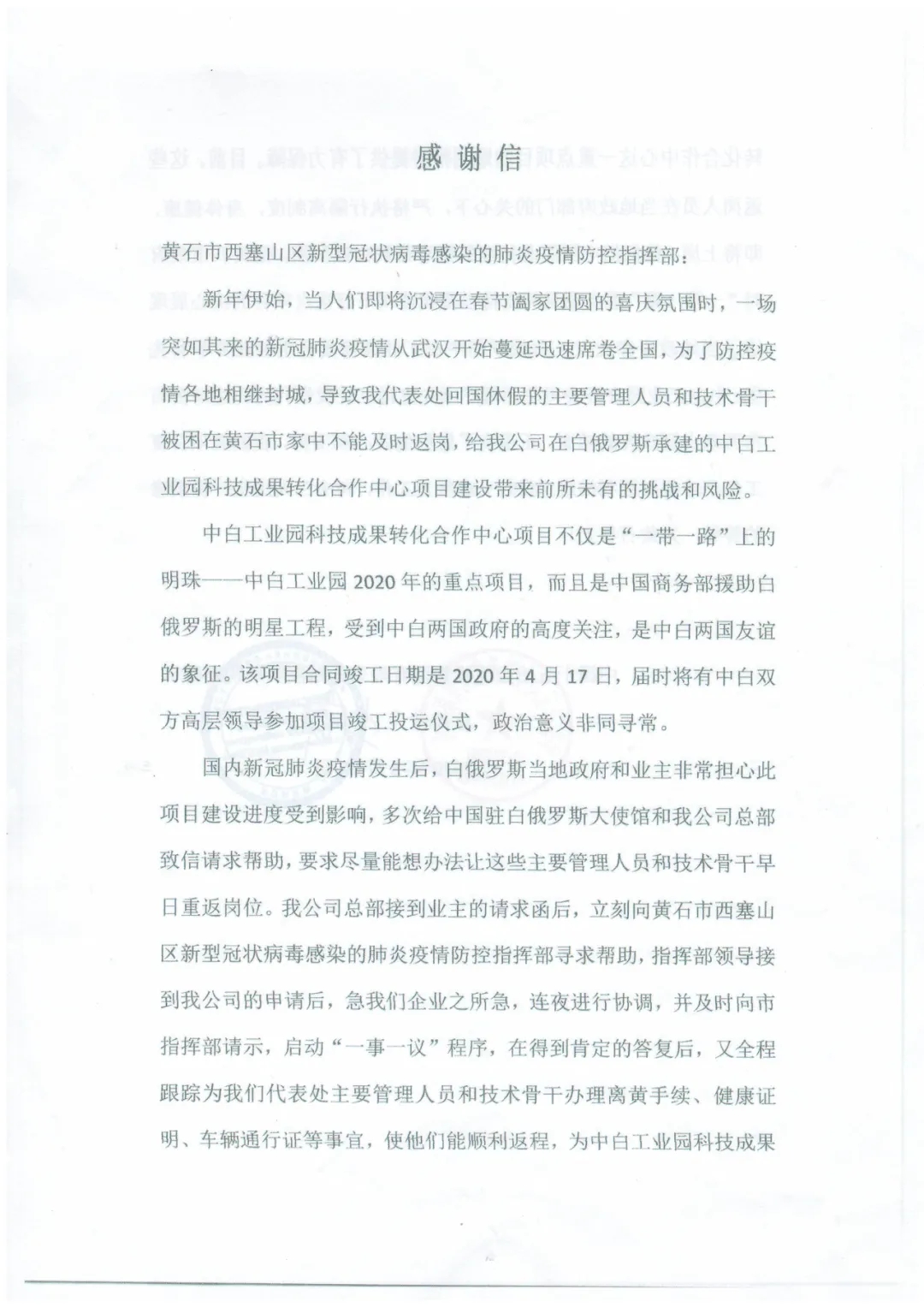 感谢信介绍,该公司承建的中白工业园科技成果转化合作中心项目,受到中白两国政府的高度关注,该项目合同竣工日期是2020年4月17日。国内新冠肺炎疫情发生后,该代表处回国休假的主要管理人员和技术骨干被困在黄石市家中不能及时返岗,给该项目建设带来前所未有的挑战和风险。