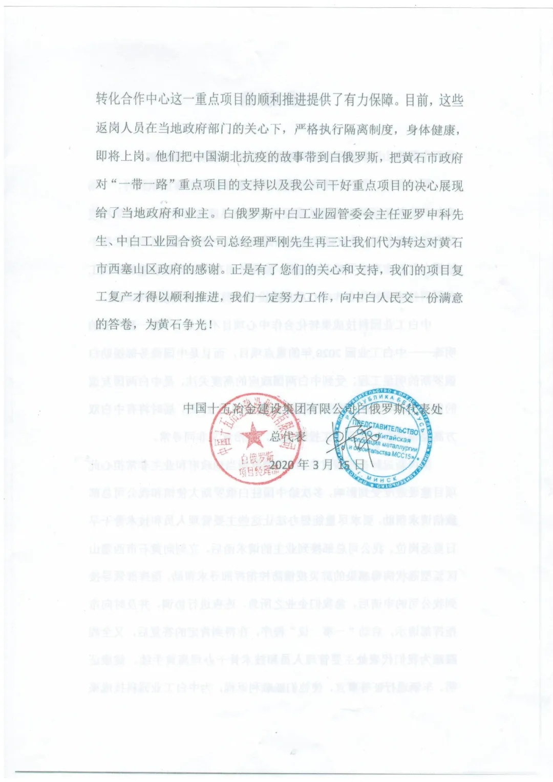 3月15日,西塞山区收到一封穿越万里的感谢信,发信人是中国十五冶金建设集团有限公司白俄罗斯代表处,为了感谢西塞山区对该公司企业全面复工复产提供了大力支持帮助。