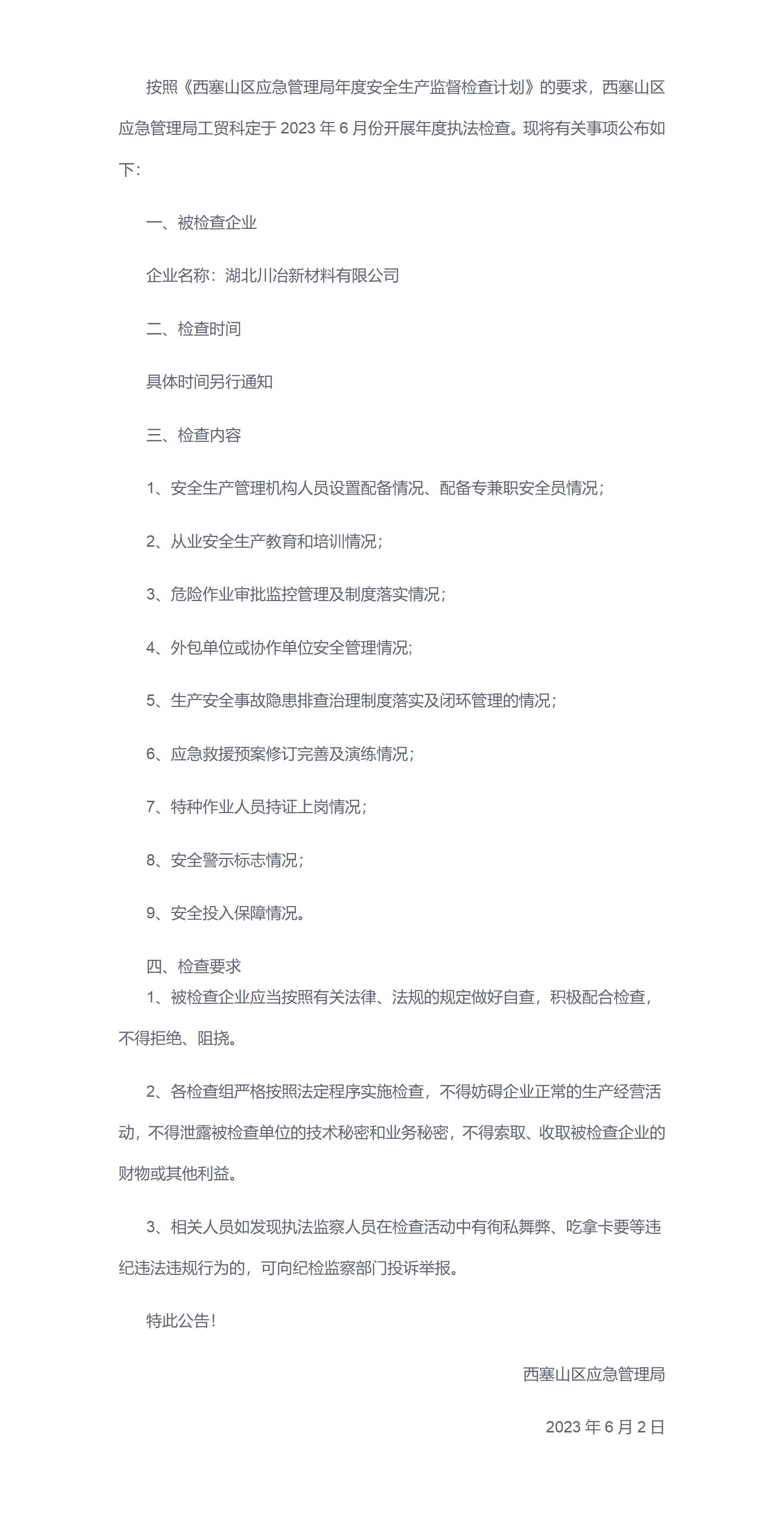 西塞山区应急管理局工贸行业2023年二季度“双随机、一公开”专项执法检查公告