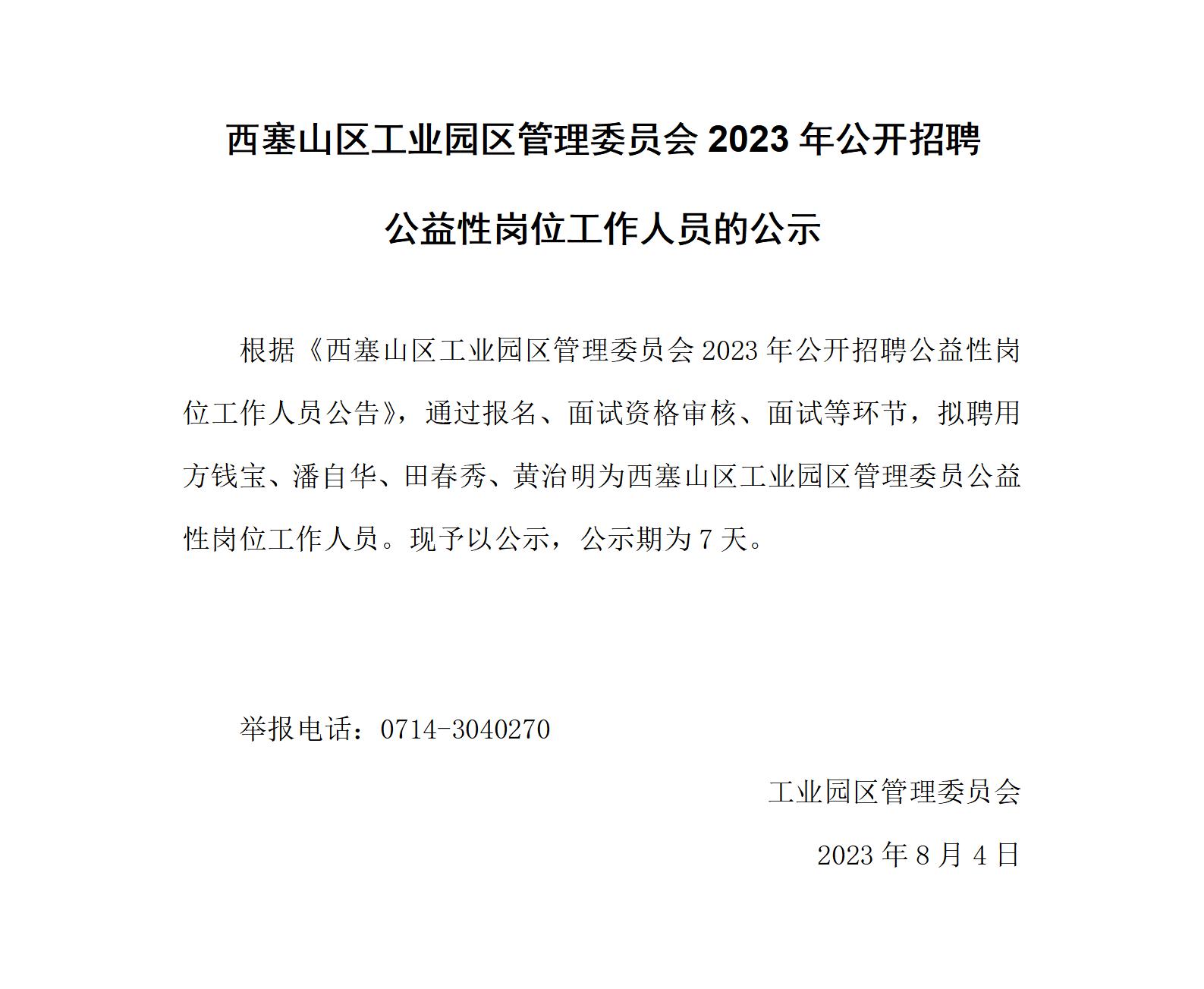 西塞山区工业园区管理委员会2023年公开招聘公益性岗位工作人员的公示