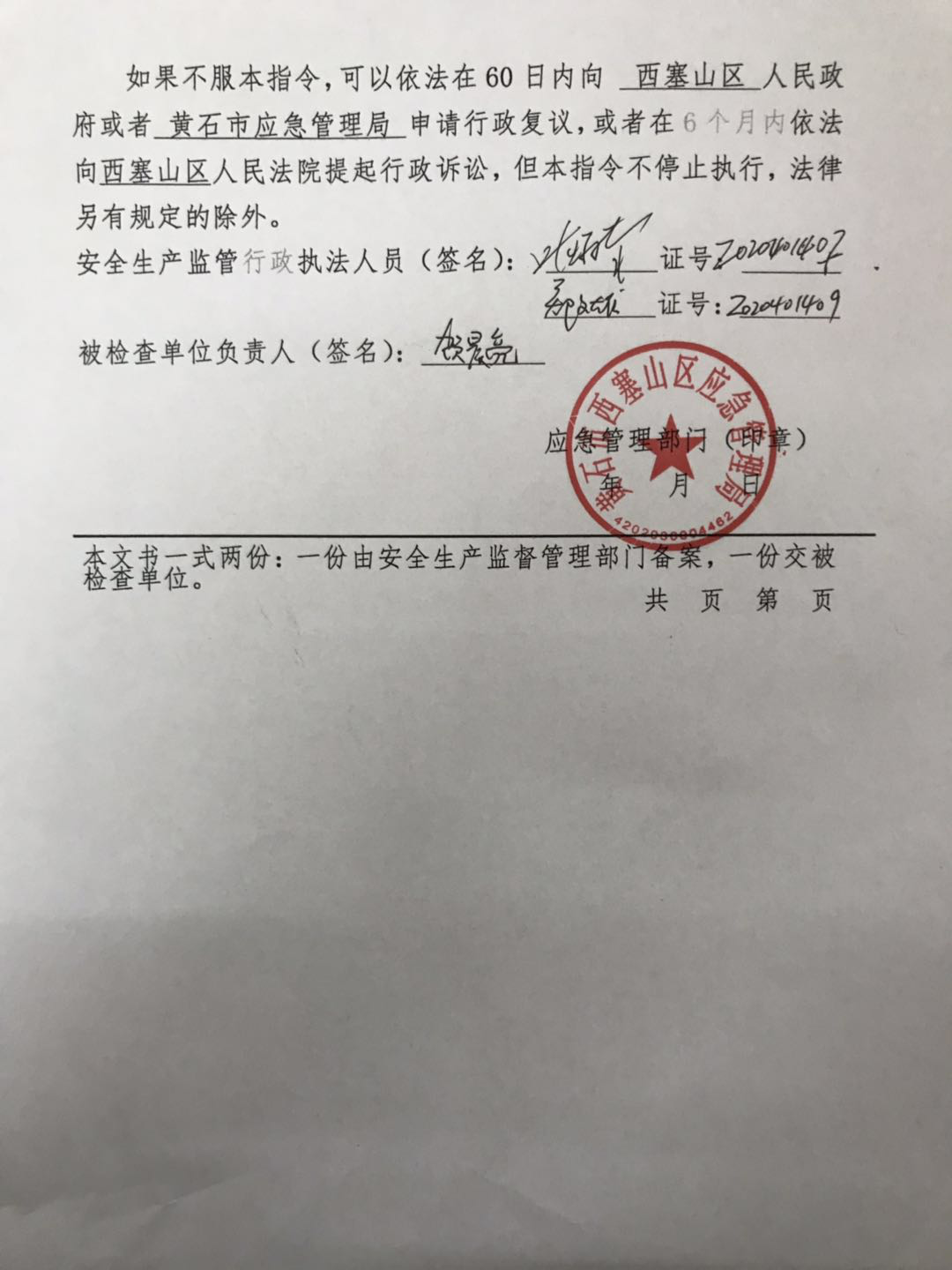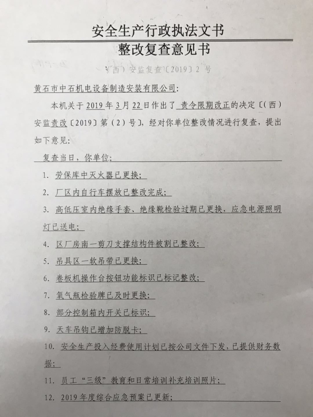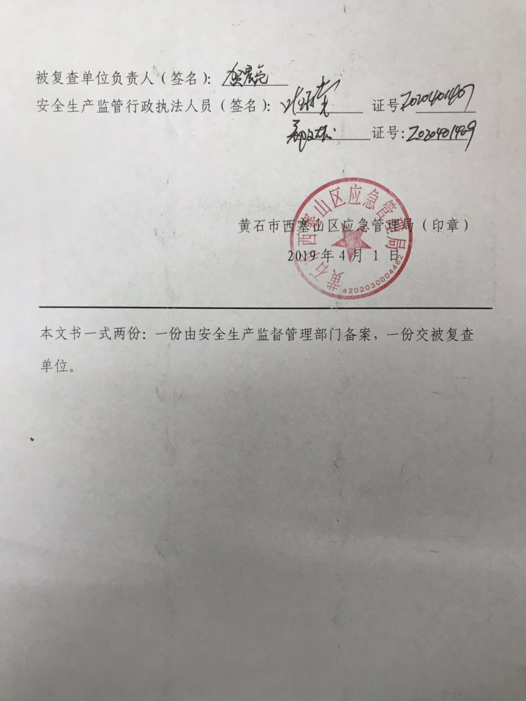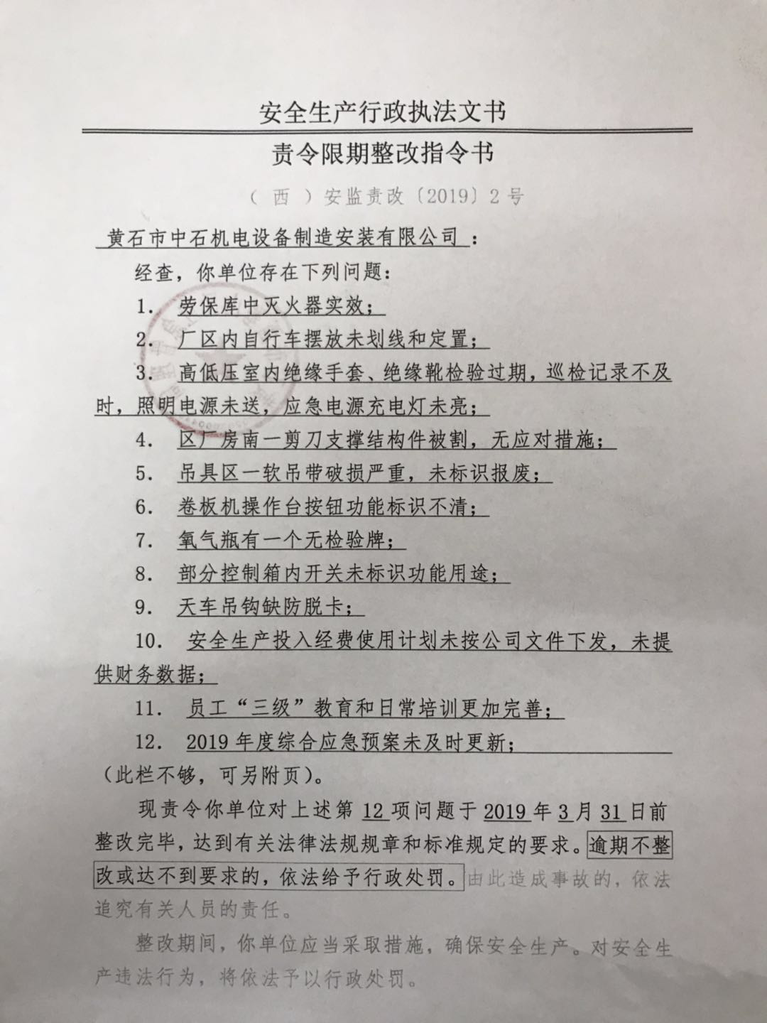 根据相关工作安排,西塞山区安监局工贸科2019年3月20日,组织专家对黄石市中石机电设备制造安装有限公司开展“双随机”检查, 现将执法检查结果公示如下: