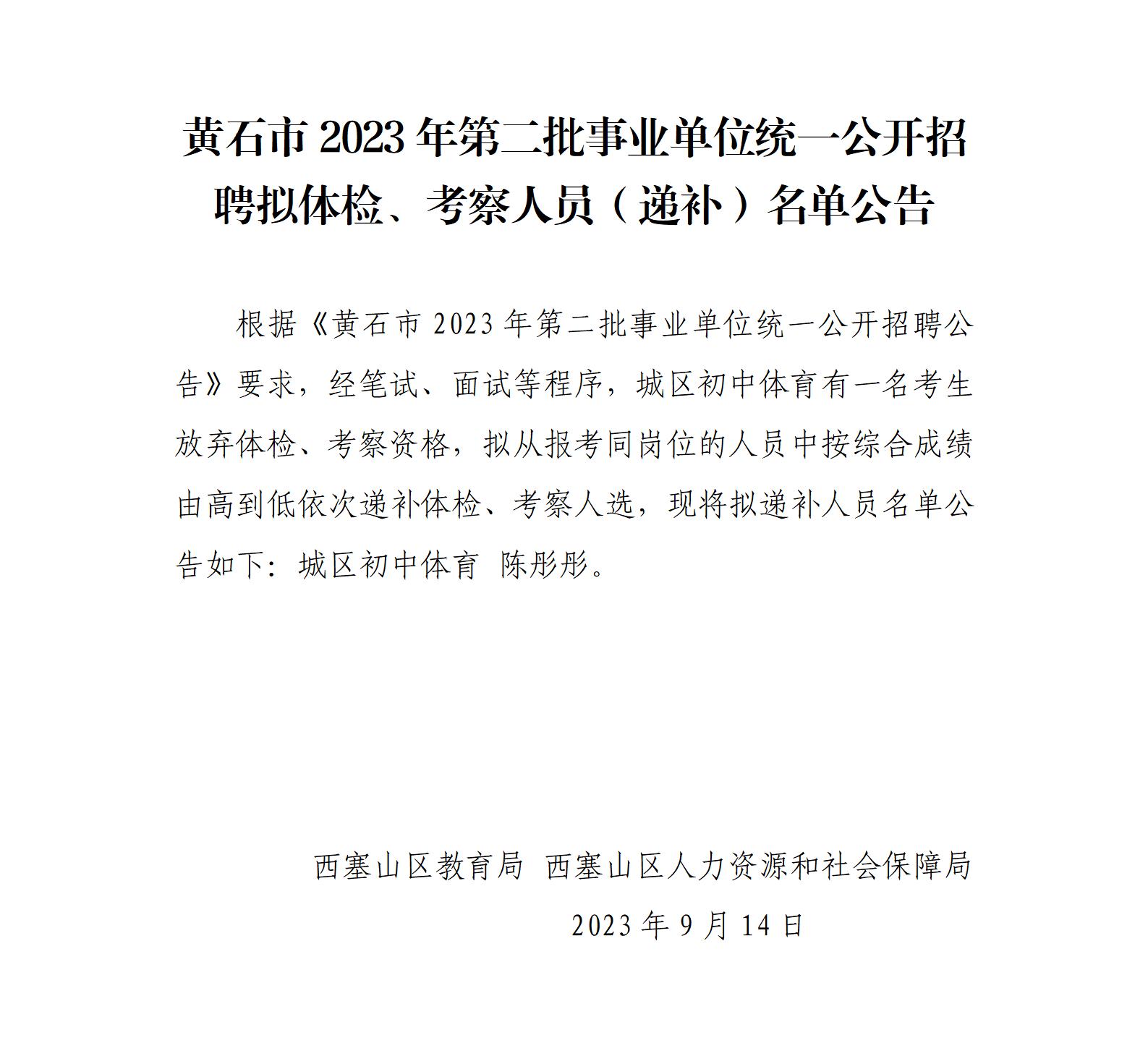 黄石市2023年第二批事业单位统一公开招聘拟体检、考察人员(递补)名单公告