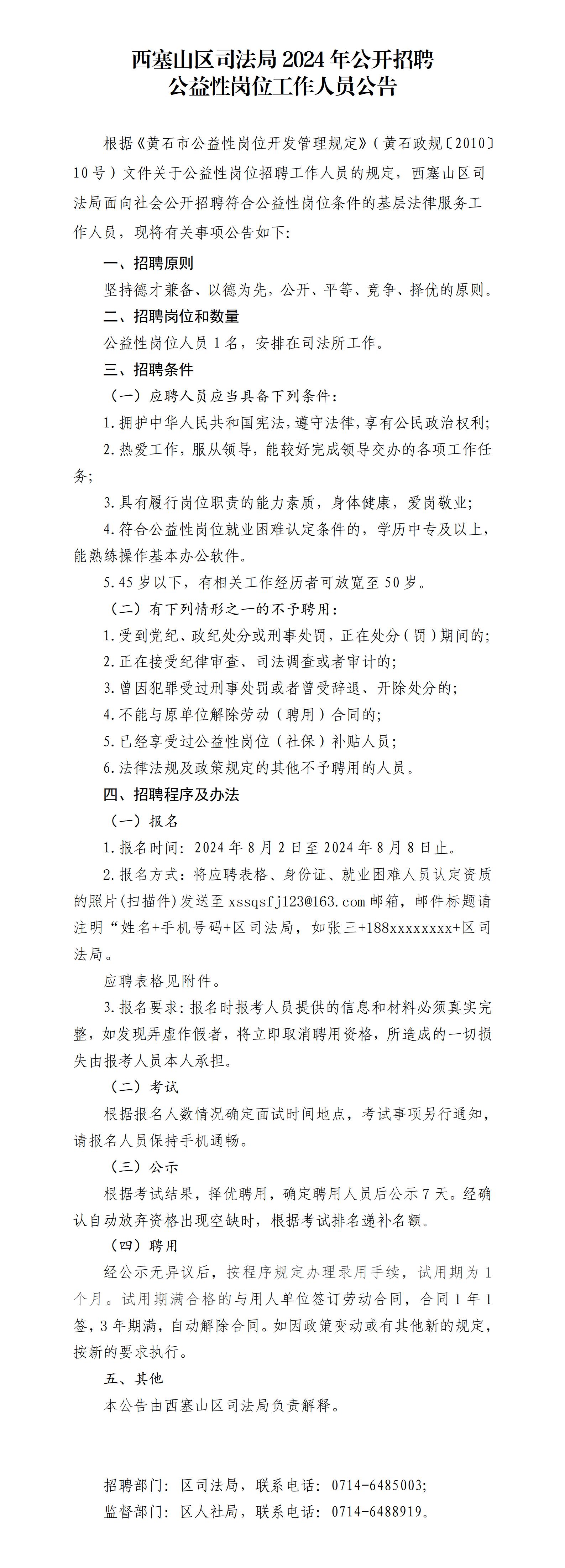 西塞山区司法局2024年公开招聘公益性岗位工作人员公告