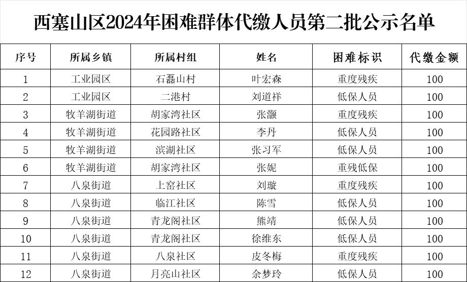 西塞山区2024年困难群体代缴人员第二批公示名单