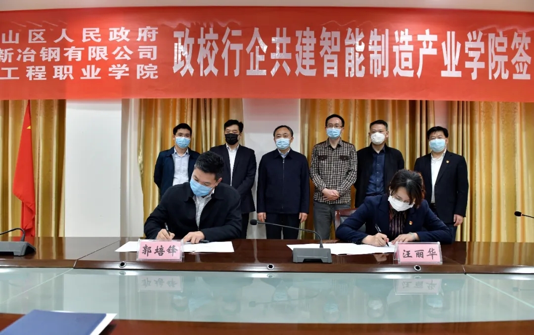 副校长汪丽华、西塞山区政府副区长唐砚冰、湖北新冶钢有限公司党委副书记郭培锋代表政校企三方签订共建智能制造产业学院合作协议和产教融合校企合作战略协议。