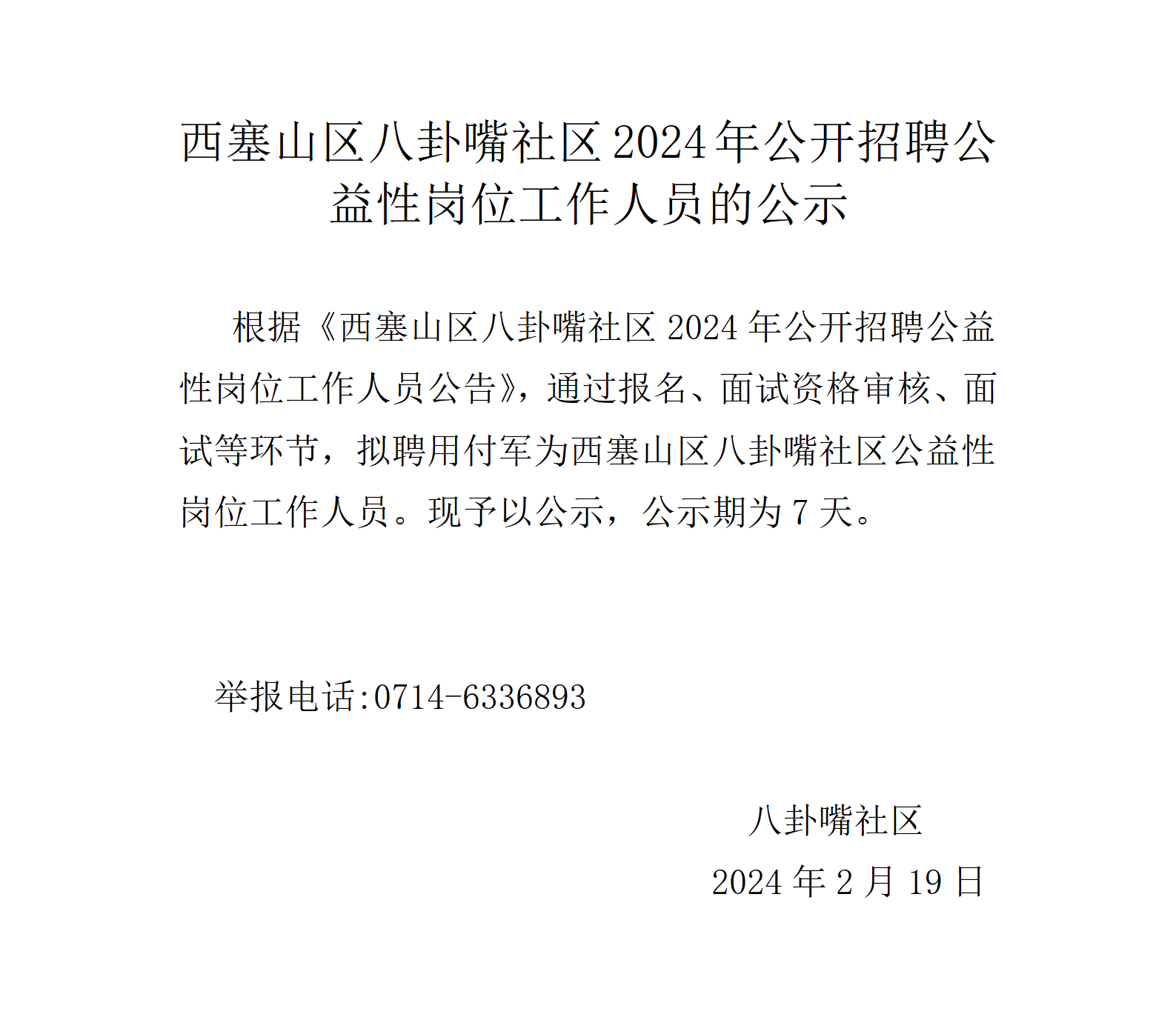 西塞山区八卦嘴社区2024年公开招聘公益性岗位工作人员的公示