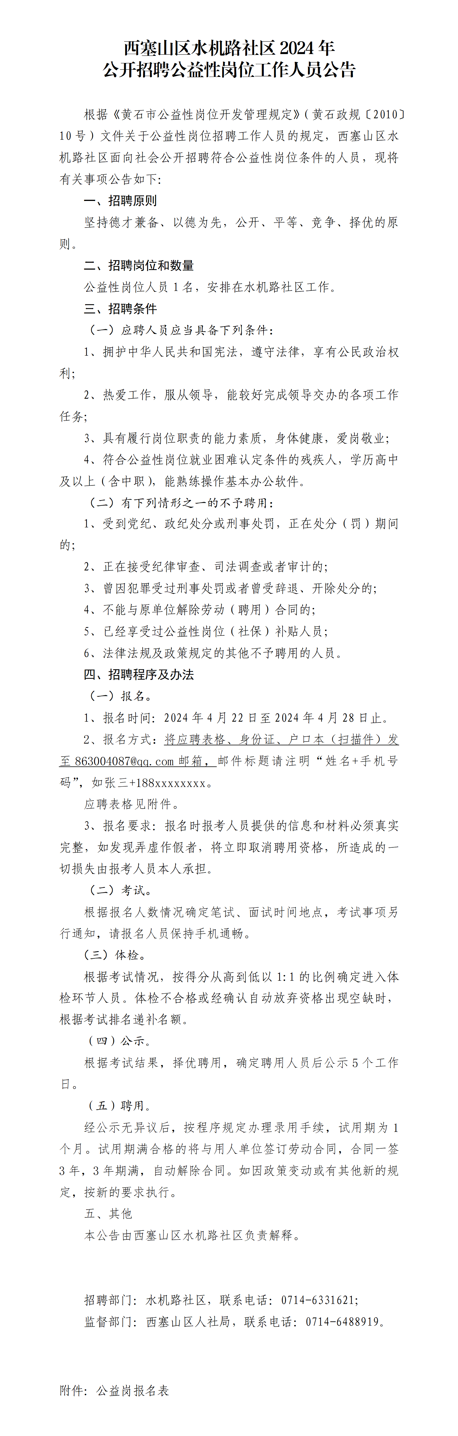 西塞山区水机路社区2024年公开招聘公益性岗位工作人员公告