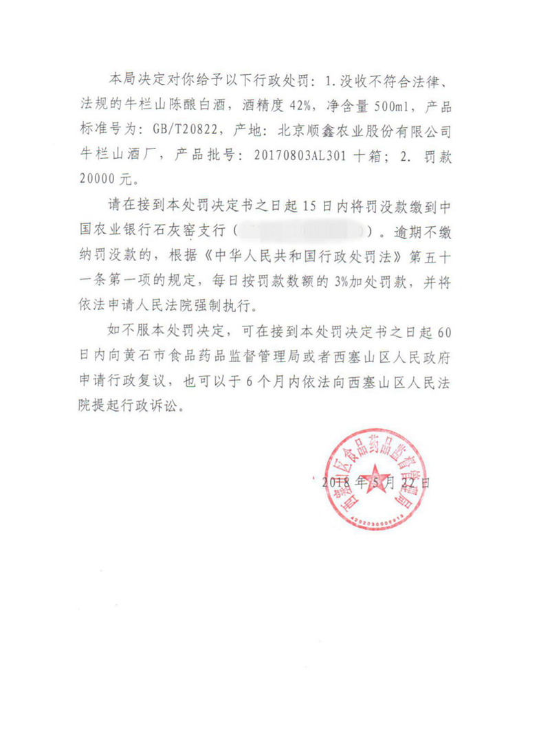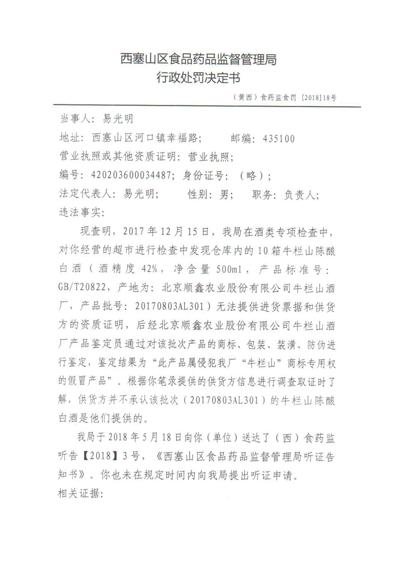 (黄西)食药监食罚 [2018]18号 易光明行政处罚决定书