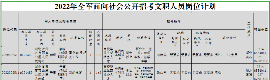 根据计划安排,报考人员可以于2021年12月5日至9日通过军队人才网报名,2022年1月9日全军组织统一考试,7月底前完成面试体检、政审考察、公示审批和补充录用等工作。以下为招录岗位,欢迎广大适龄青年报考西塞山区人民武装部,在西塞山区人民武装部实现人生的军营梦,报名请登录http://81rc.81.cn/(中国人民解放军军队人才网)。