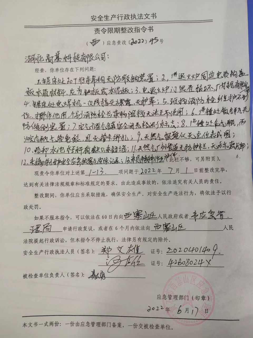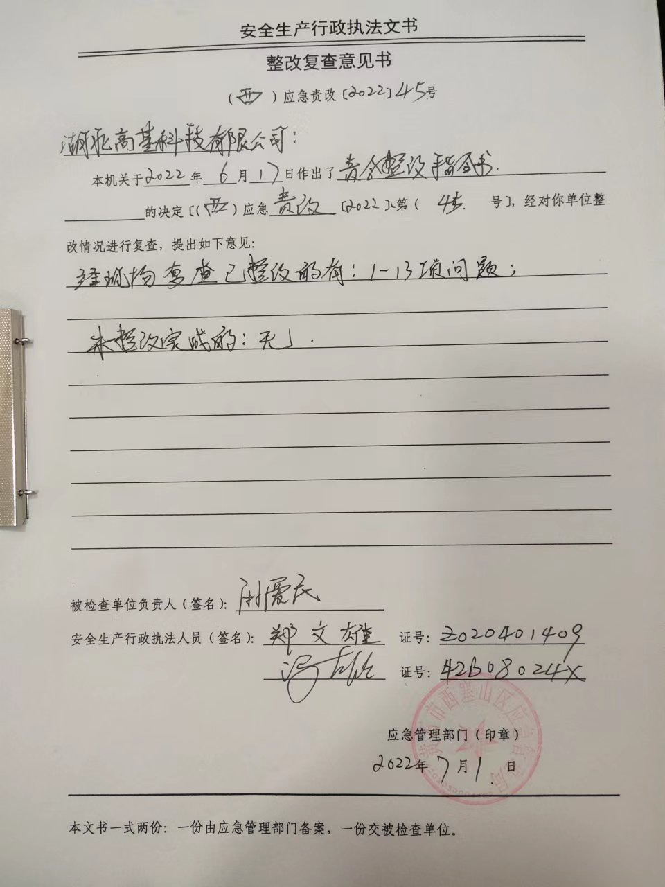 西塞山区应急管理局工贸科2022年二季度“双随机、一公开”专项执法检查结果公示