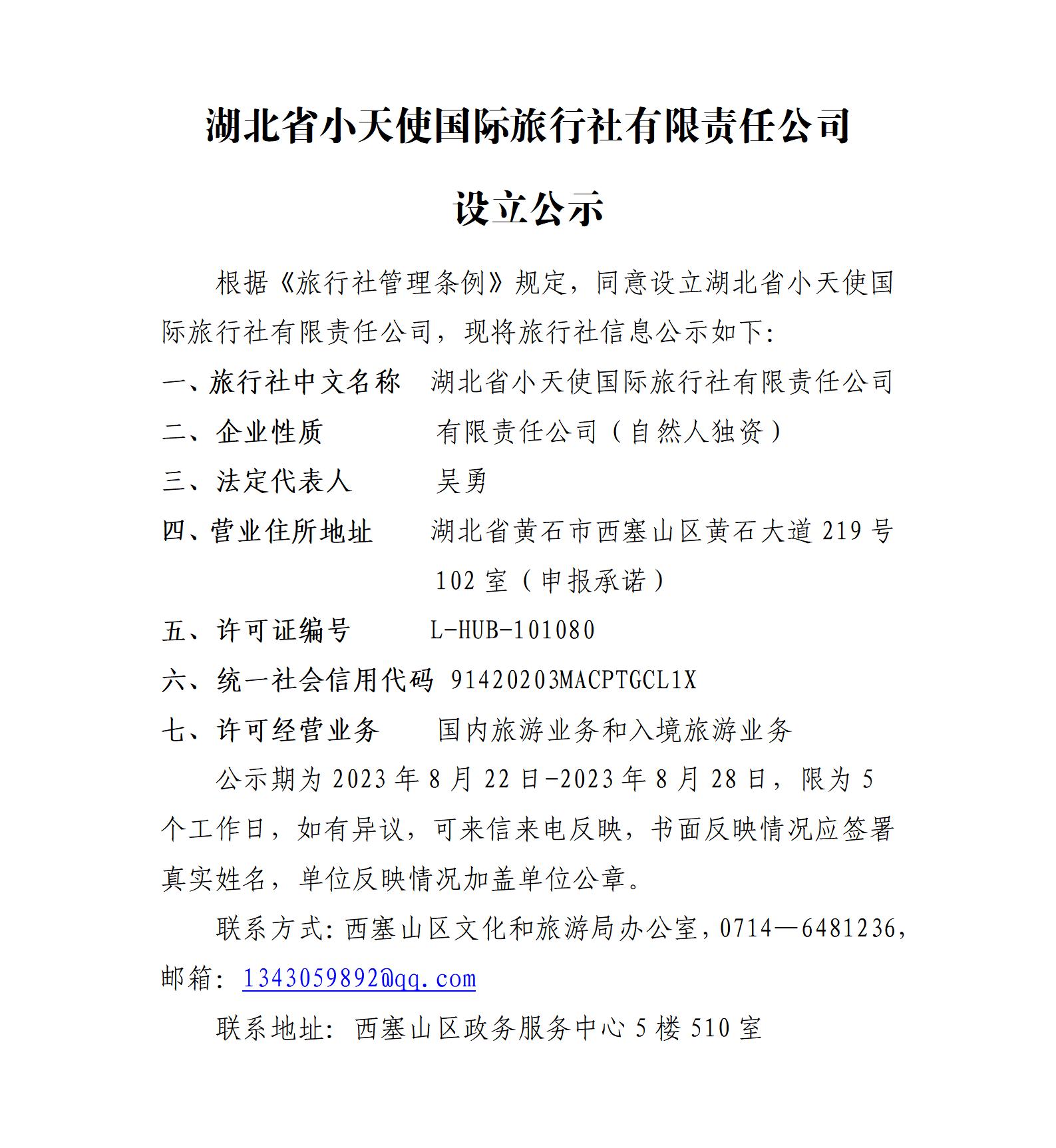 湖北省小天使国际旅行社有限责任公司设立公示