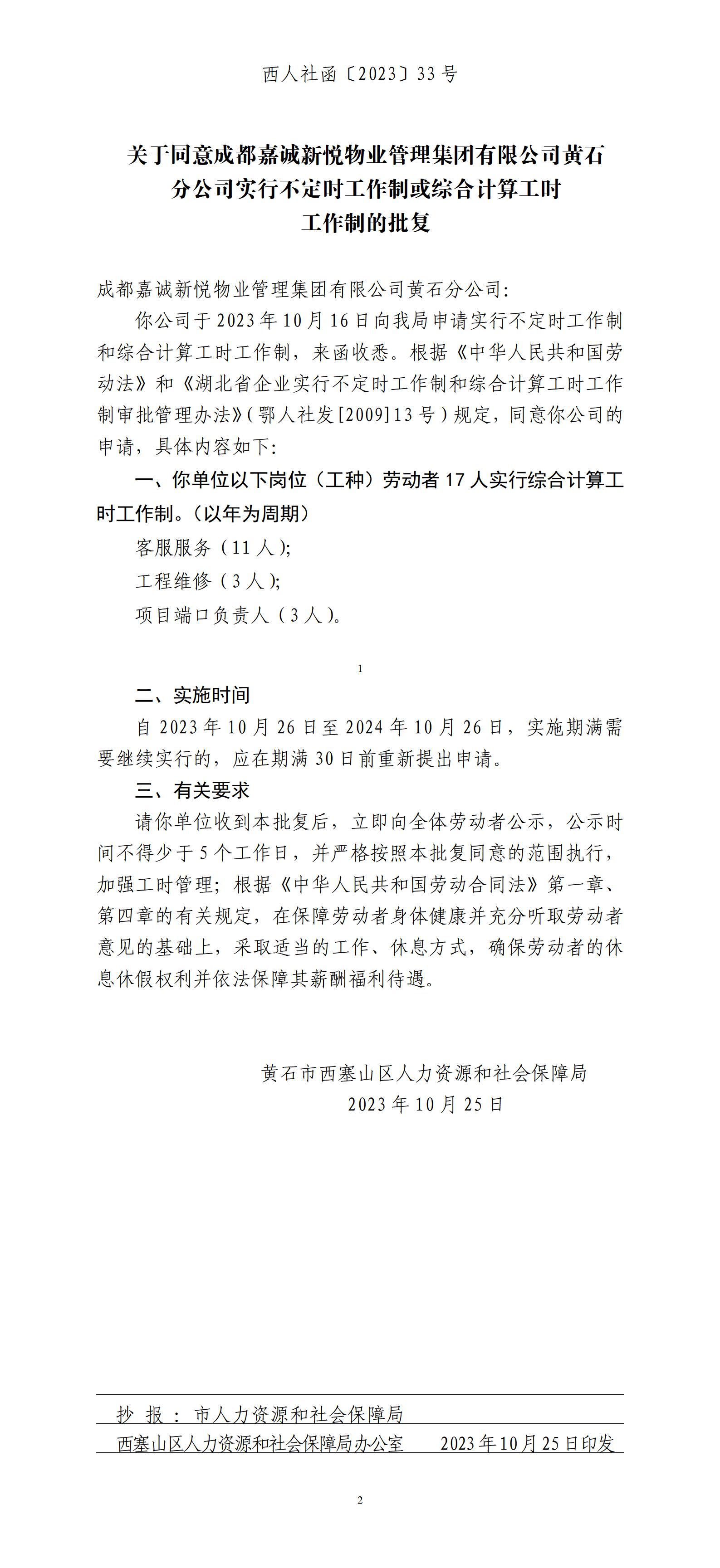 关于同意成都嘉诚新悦物业管理集团有限公司黄石分公司实行不定时工作制或综合计算工时工作制的批复