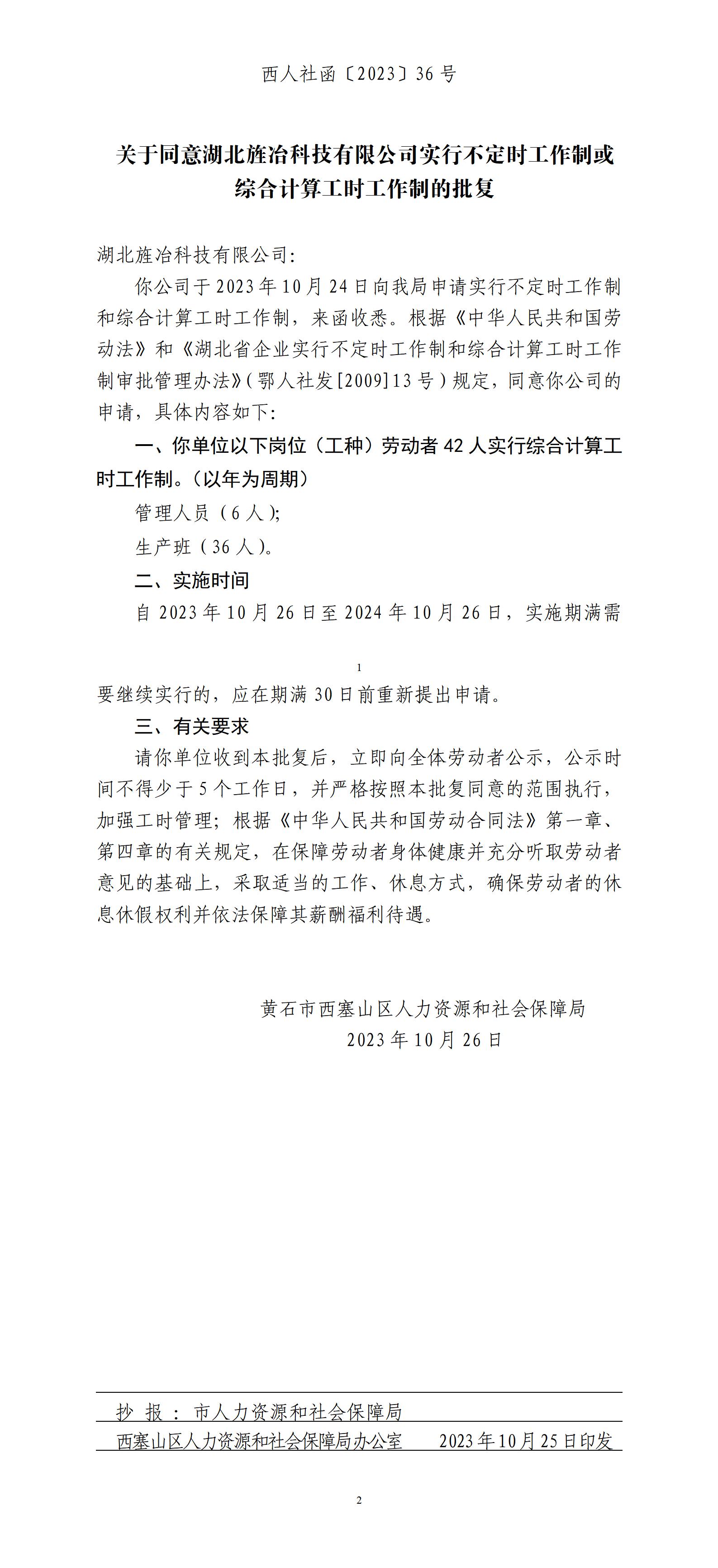关于同意湖北旌冶科技有限公司实行不定时工作制或综合计算工时工作制的批复