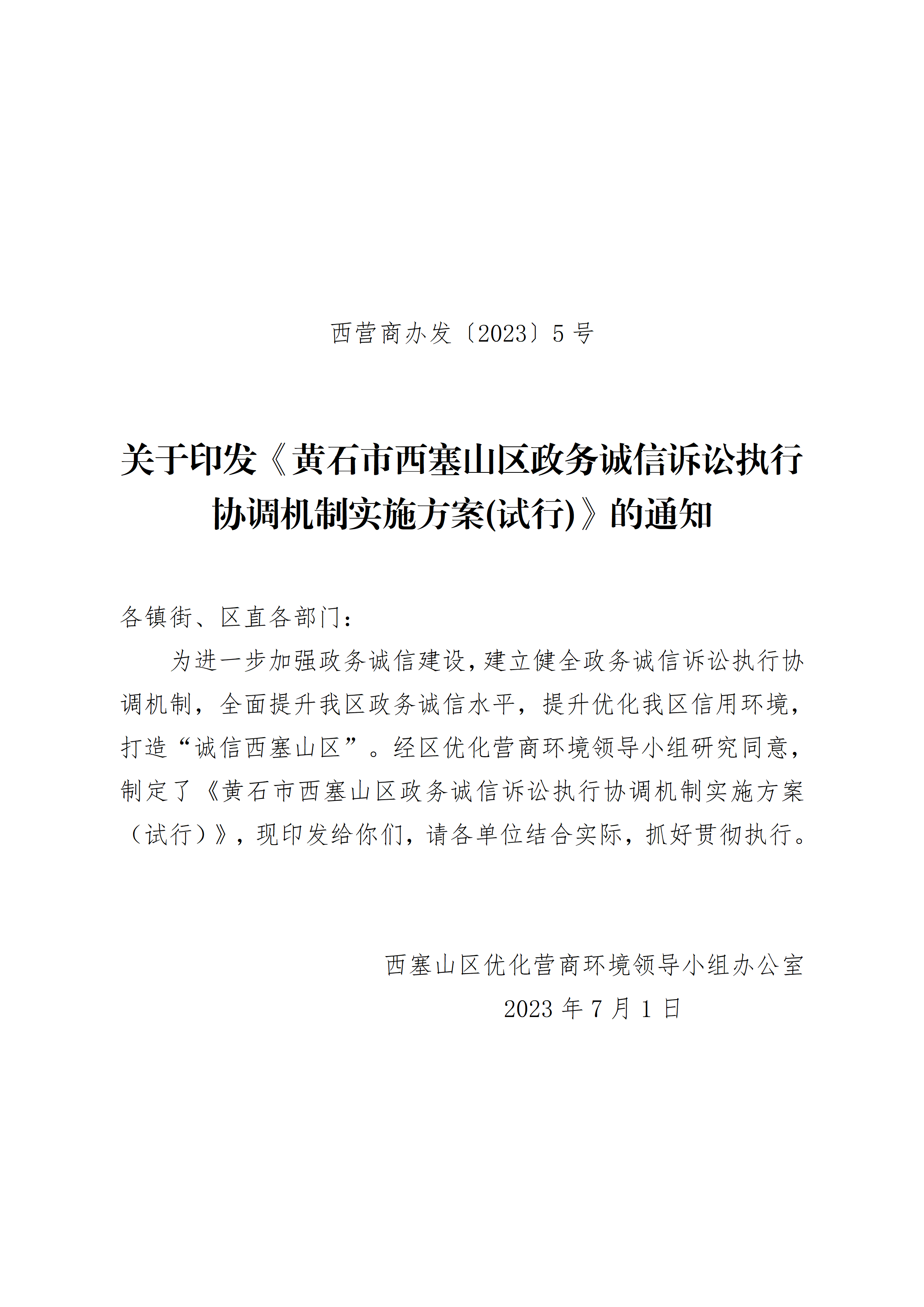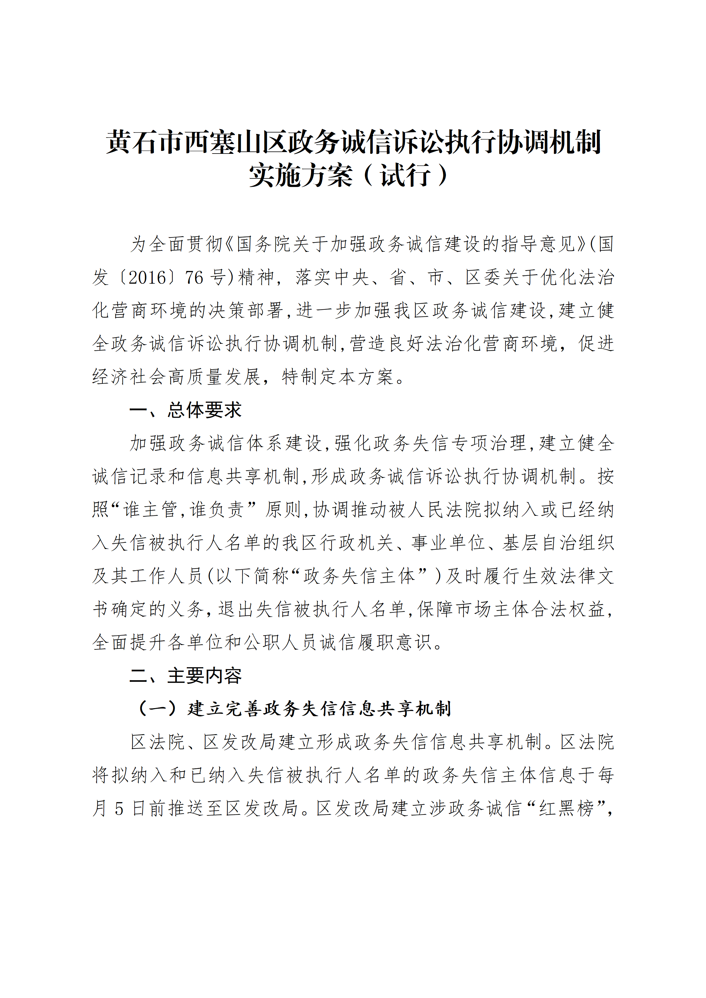 关于印发《黄石市西塞山区政务诚信诉讼执行协调机制实施方案(试行)》的通知