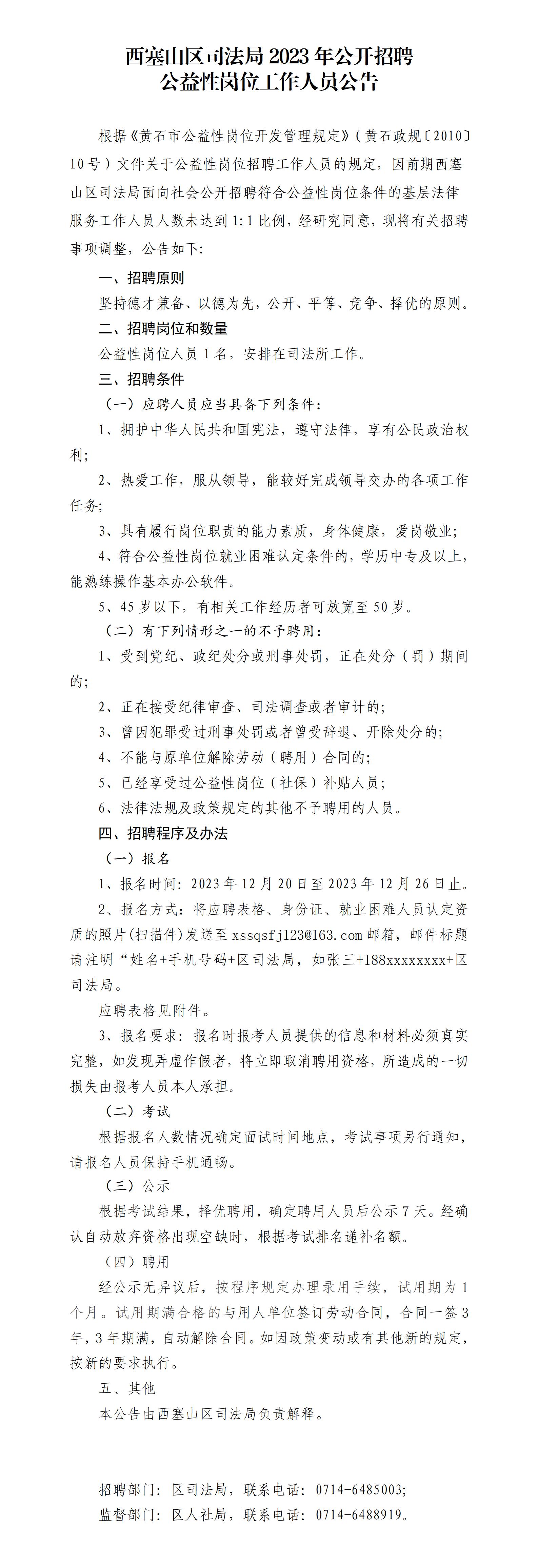 西塞山区司法局2023年公开招聘公益性岗位工作人员公告