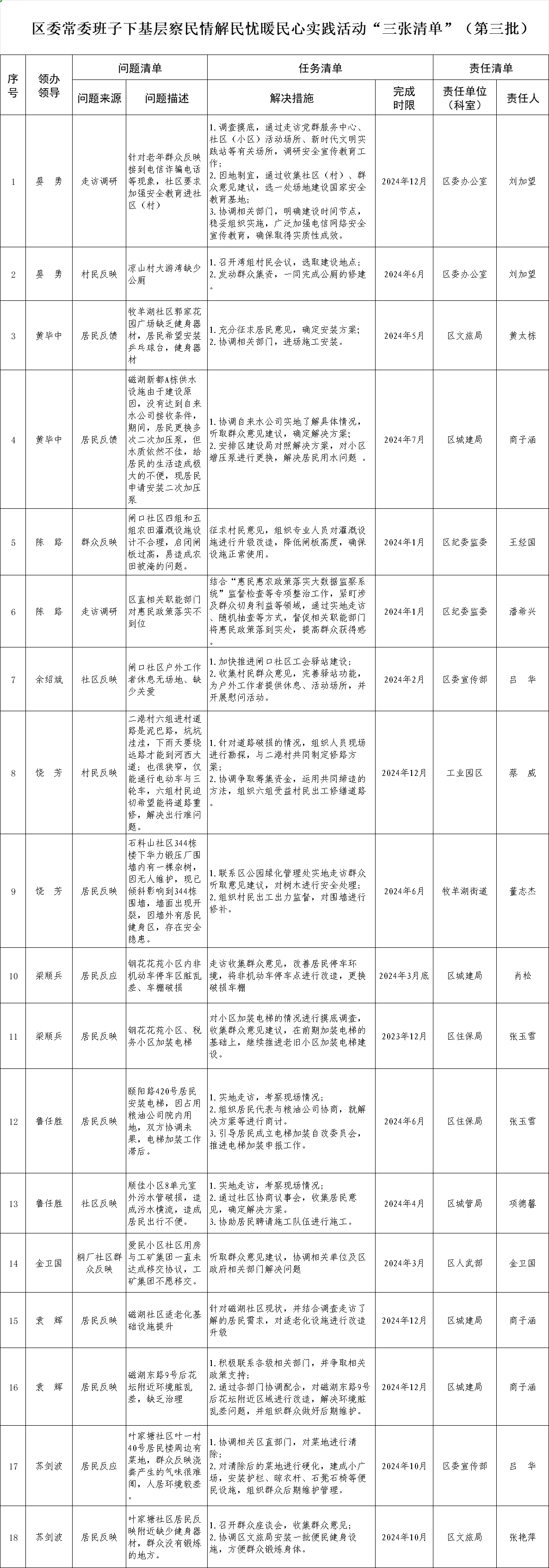 区委常委班子下基层察民情解民忧暖民心实践活动“三张清单”(第三批)