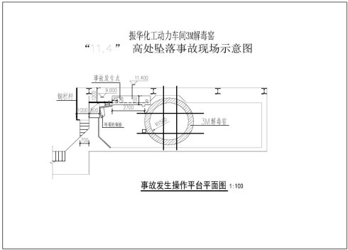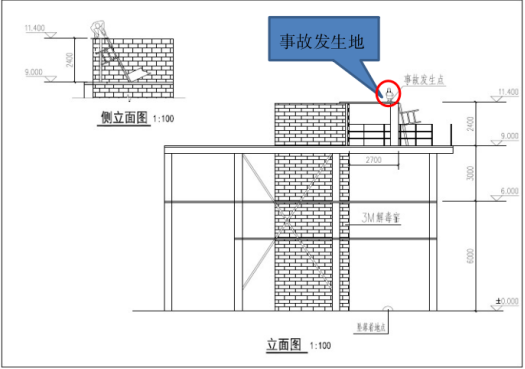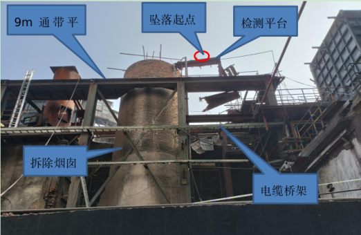 1.事故发生在振华公司动力车间3米解毒窑烟囱拆除现场。该烟囱位于振华公司厂区内,设计高度50m,圆筒形砖混结构,烟囱外壁设爬梯可从其底部攀登至顶部,烟囱下部南面外壁距地面约11.4m处设置一个检测平台,烟囱南面和西面距地面约9m高度设置通道平台,西面检修工作平台下方距地面约6m处设置一个电缆桥架(见事故现场立面图及事故现场照片一、二)。