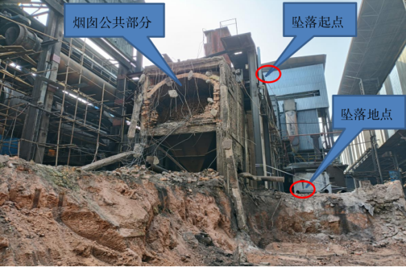 2.拆除现场东面为动力车间解毒窑厂房、南面为动力车间解毒窑除尘器和空压机组、西面为焙烧车间大窑厂房、北面为焙烧车间混料厂房,其北面设计使用同规格的一个烟囱已拆除,底部留下与正在拆除烟囱相连接的公共部分(见事故现场照片二、三)。