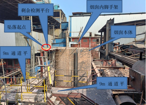 1.烟囱拆除方式为从上至下人工剔打,垃圾等拆除物由车辆装运出场。本烟囱拆除工程自2024年10月29开始动工,至11月4日事故发生当天,原50m高度的烟囱被拆除至底部剩下约11.4m高度的圆锥筒体;圆锥筒体上口直径约3m,其内部搭设钢管脚手架用于施工人员站位(见事故现场平面、立面示意图及事故现场照片二、四)。