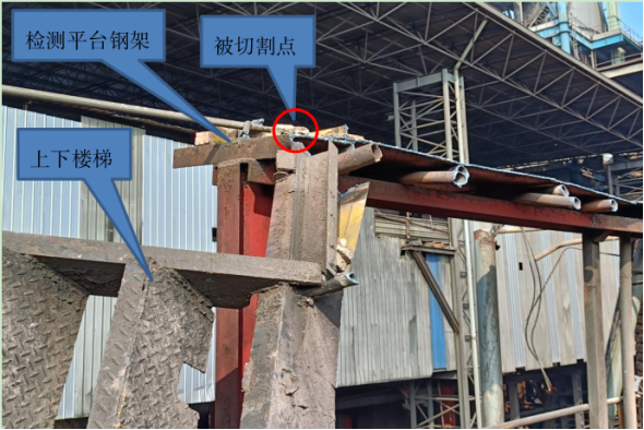 2.原检测平台是由钢板和槽钢制作的钢结构方形平台,长3m、宽3m,位于烟囱西南面,离地面高度约11.4m,从烟囱南侧9m通道平台的钢制楼梯上下。至事故发生,该钢制上下楼梯被切割,剩下其上部的两级台阶仍然连接在检测平台南侧槽钢梁上;钢制检测平台全部防护栏、中间大部分平台钢板及槽钢钢架梁已被切割掉,只剩下西面一段长约2.7m、宽约0.6m没有防护栏的边沿平台,和连接在该平台边沿末端、未被完全切断倾斜垮塌的槽钢框架梁,连接部位可见明显的被切割点(见事故现场平面、立面示意图及事故现场照片二、四、五、六)。