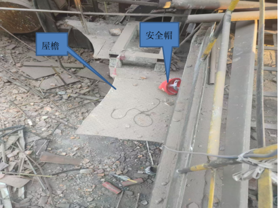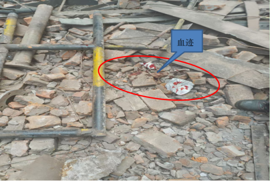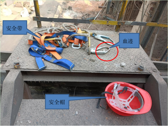 4.检测平台西侧下方距离烟囱约2.5m的地面有当事人遗留的血迹,南端动力车间解毒窑除尘器和空压机组厂房屋檐上掉落当事人使用的安全帽;收集当事人使用的劳动防护用品,发现安全帽带断裂,安全带绳及挂钩等部件完好,挂钩上遗留有血迹(见事故现场照片七、八、九)。