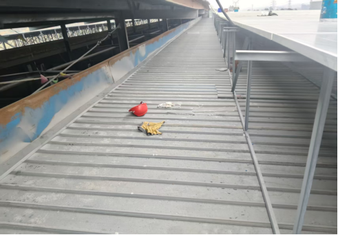 5.作业环境不佳有一定影响。屋面积灰造成难以区分彩钢板与采光瓦界限,对误踩采光瓦坠落有一定影响。