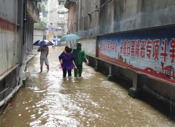 当她看到一个十来岁小男孩用脚试探水深,准备独自从居民区直接蹚出来时,她隔着老远就扯着嗓子喊:“水深危险,别乱跑,我背你过来。”她穿着雨鞋,垮哧垮哧迈过积水,半蹲下身,和同伴相互配合,将这位心急的小男孩成功背离了积水区域。