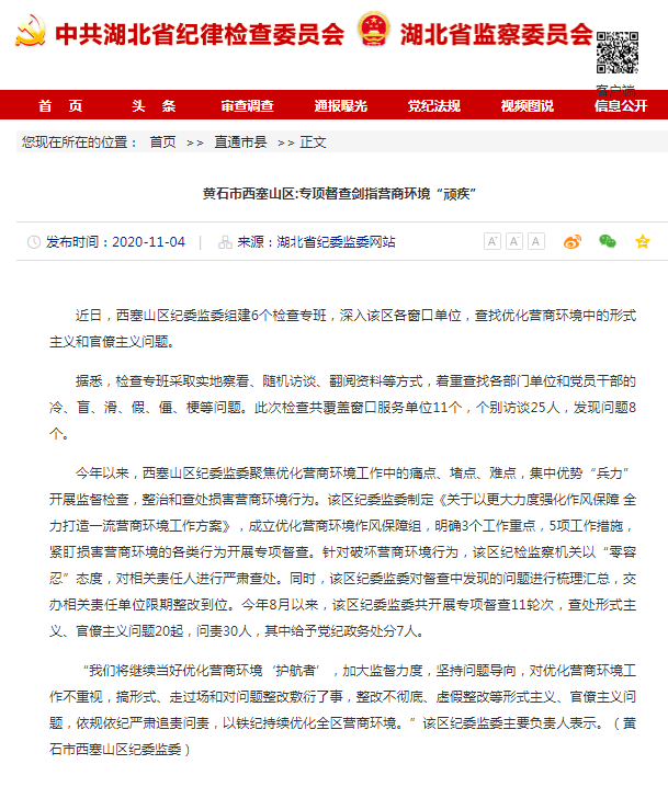 今年以来,西塞山区纪委监委聚焦优化营商环境工作中的痛点、堵点、难点,集中优势“兵力”开展监督检查,整治和查处损害营商环境行为。该区纪委监委制定《关于以更大力度强化作风保障全力打造一流营商环境工作方案》,成立优化营商环境作风保障组,明确3个工作重点,5项工作措施,紧盯损害营商环境的各类行为开展专项督查。针对破坏营商环境行为,该区纪检监察机关以“零容忍”态度,对相关责任人进行严肃查处。同时,该区纪委监委对督查中发现的问题进行梳理汇总,交办相关责任单位限期整改到位。今年8月以来,该区纪委监委共开展专项督查11轮次,查处形式主义、官僚主义问题20起,问责30人,其中给予党纪政务处分7人。