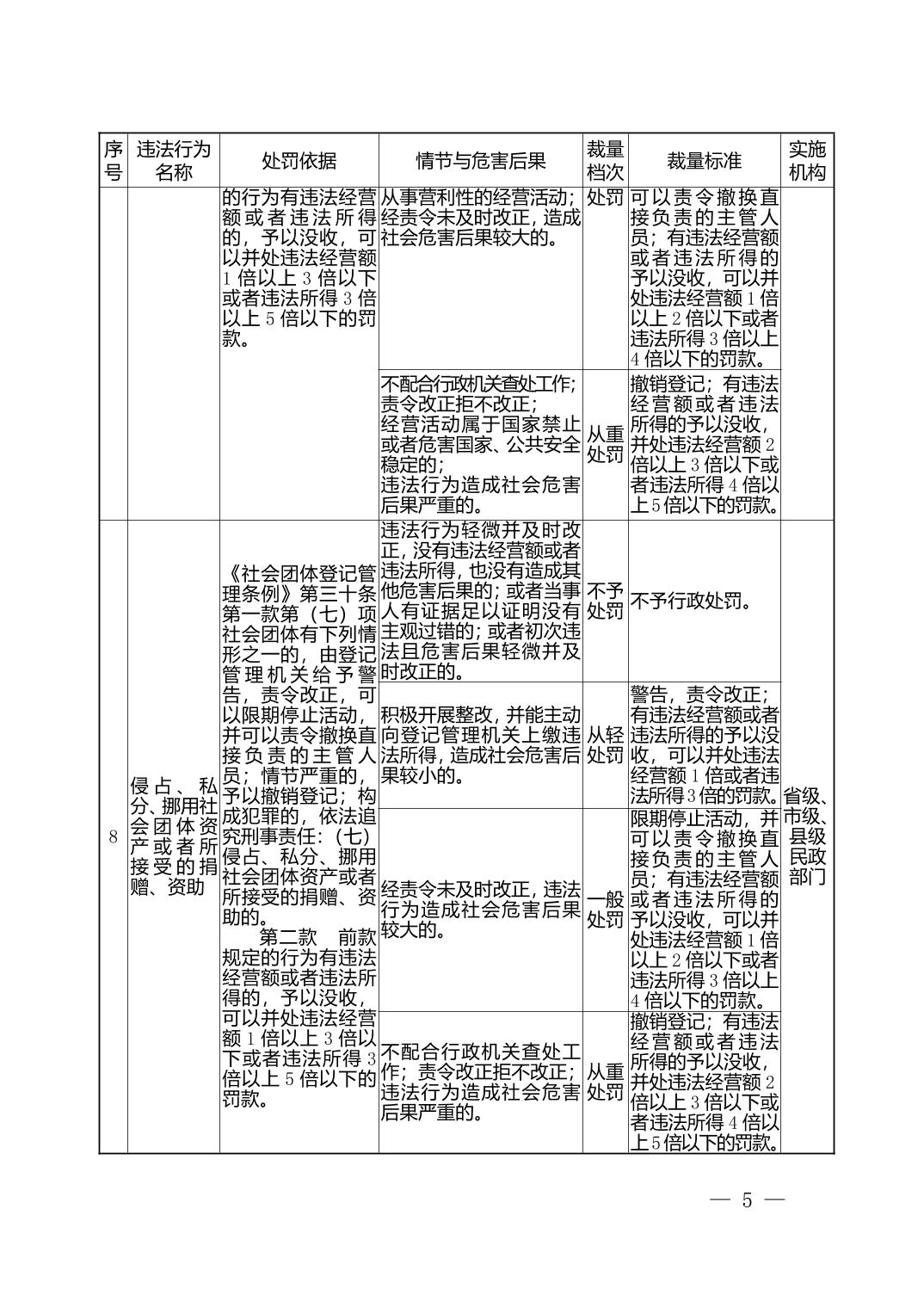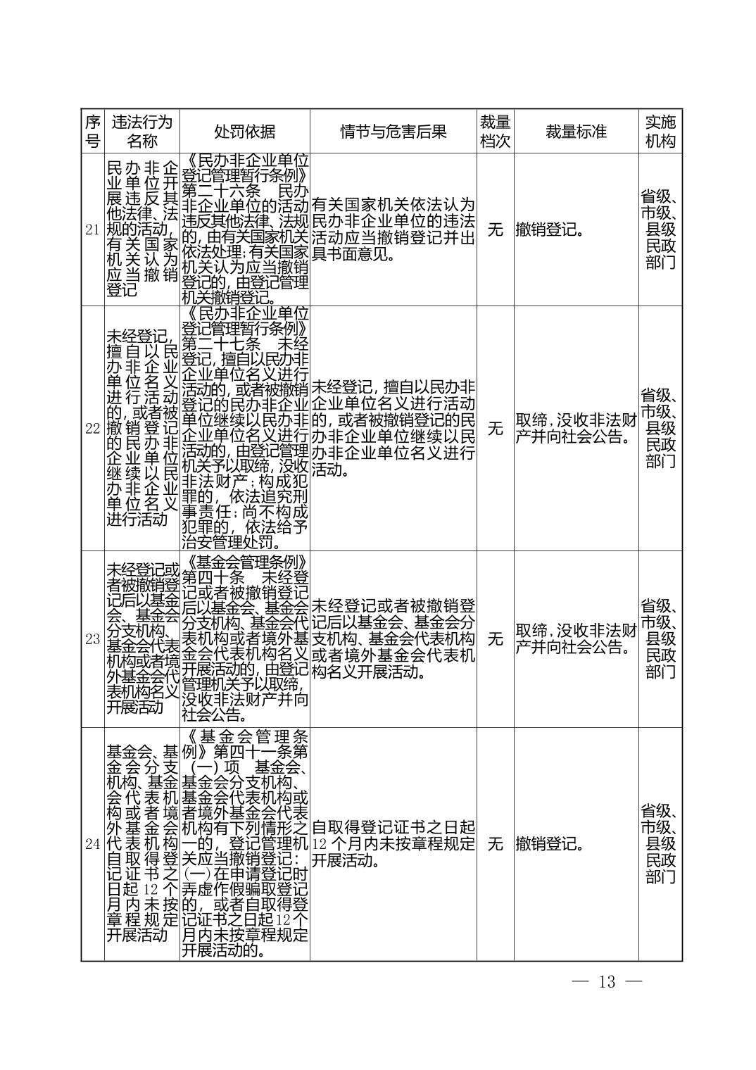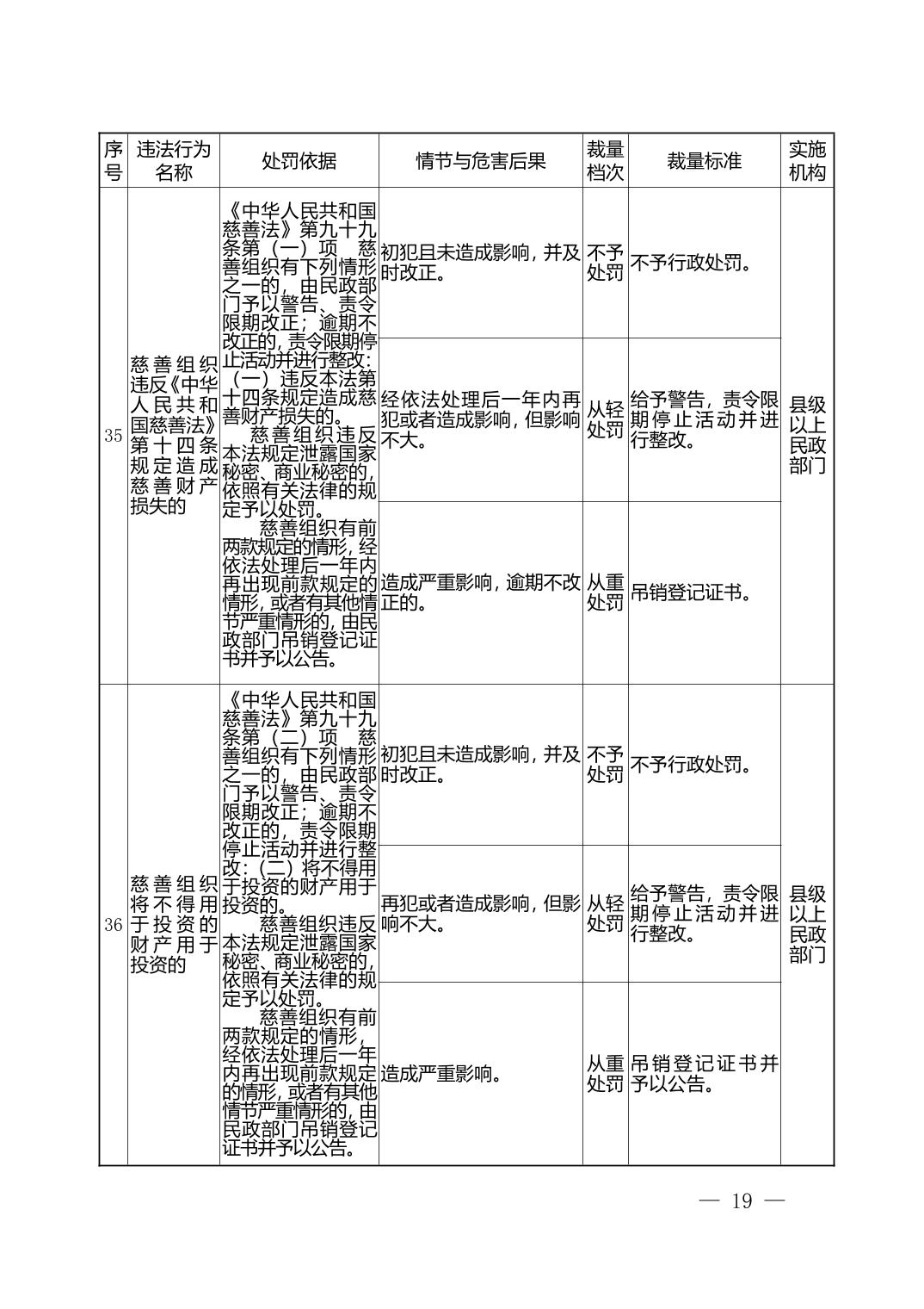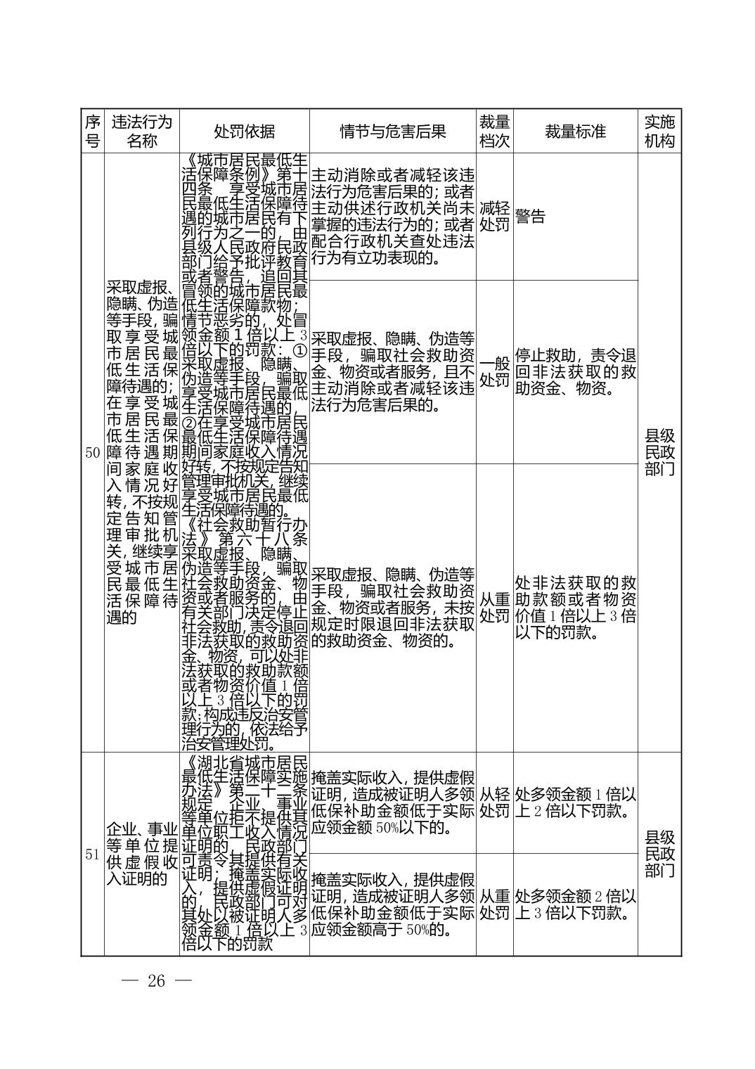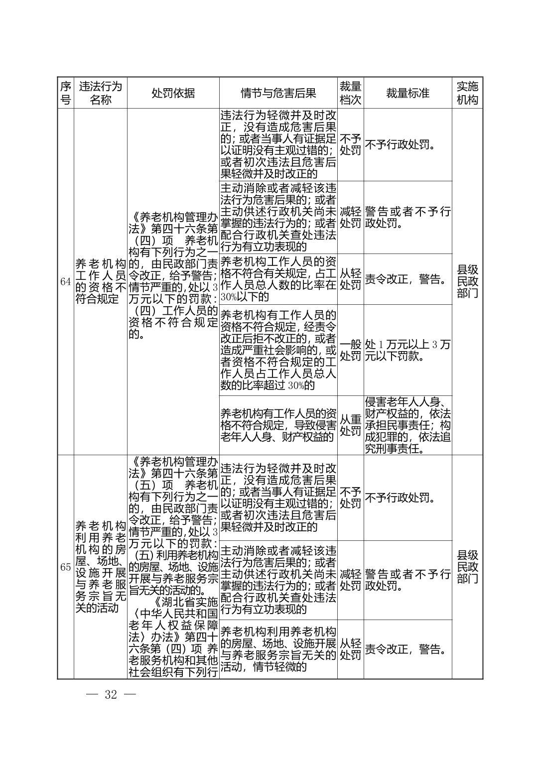 湖北省民政部门行政处罚自由裁量权基准表