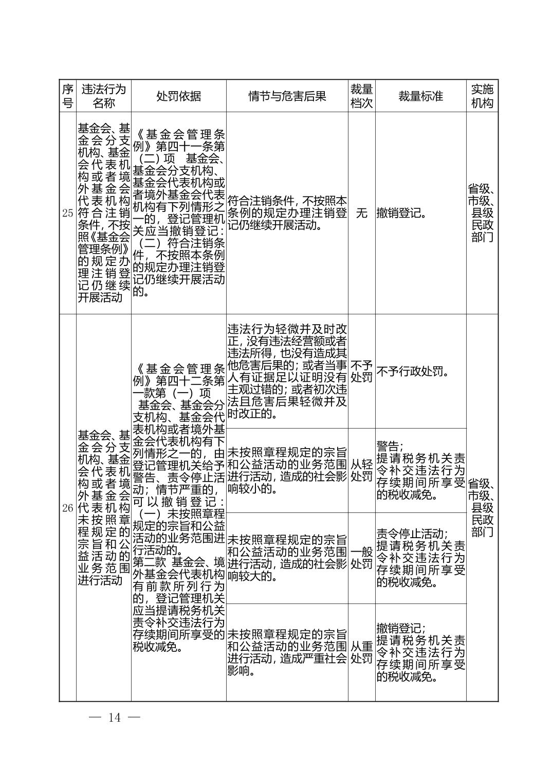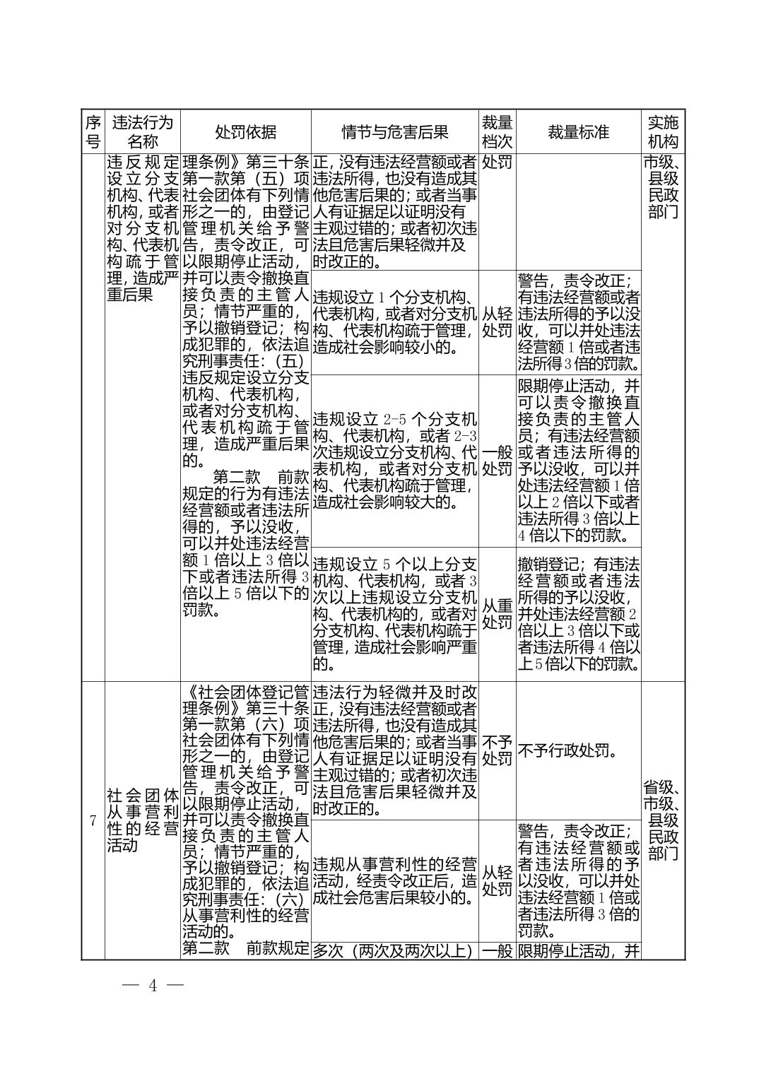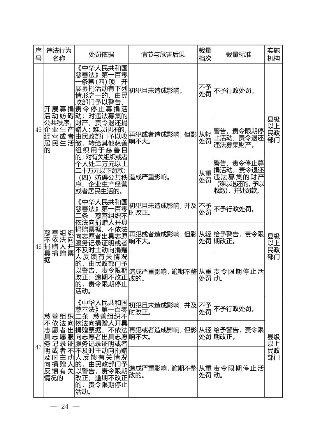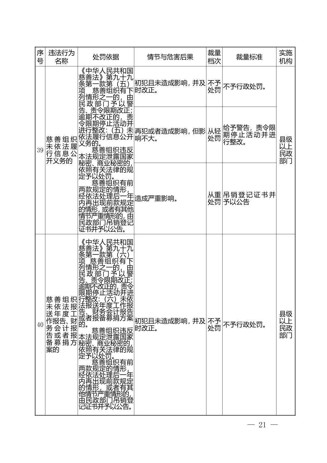 湖北省民政部门行政处罚自由裁量权基准表
