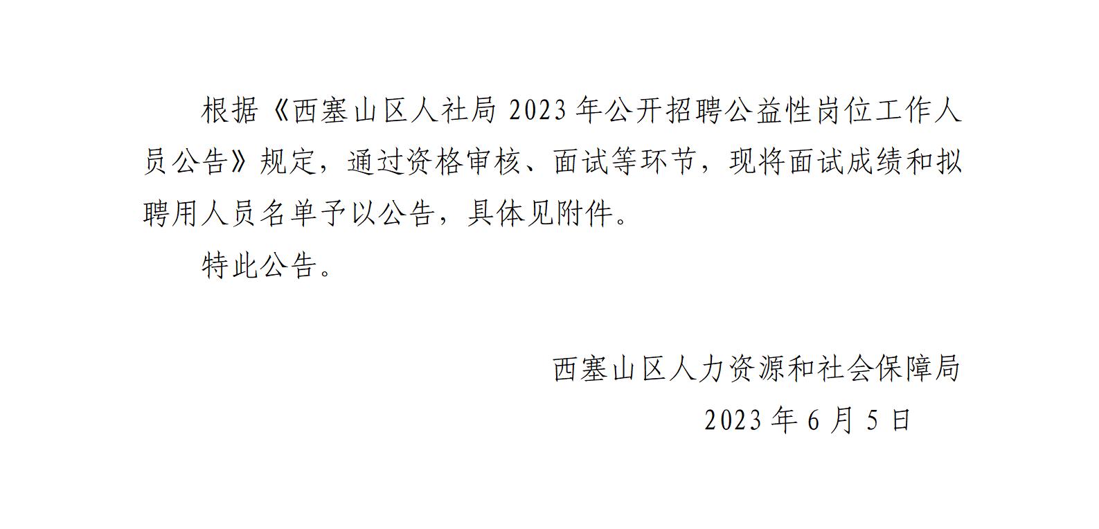 西塞山区人社局2023年公开招聘公益性岗位工作人员面试成绩及拟聘用人员公告