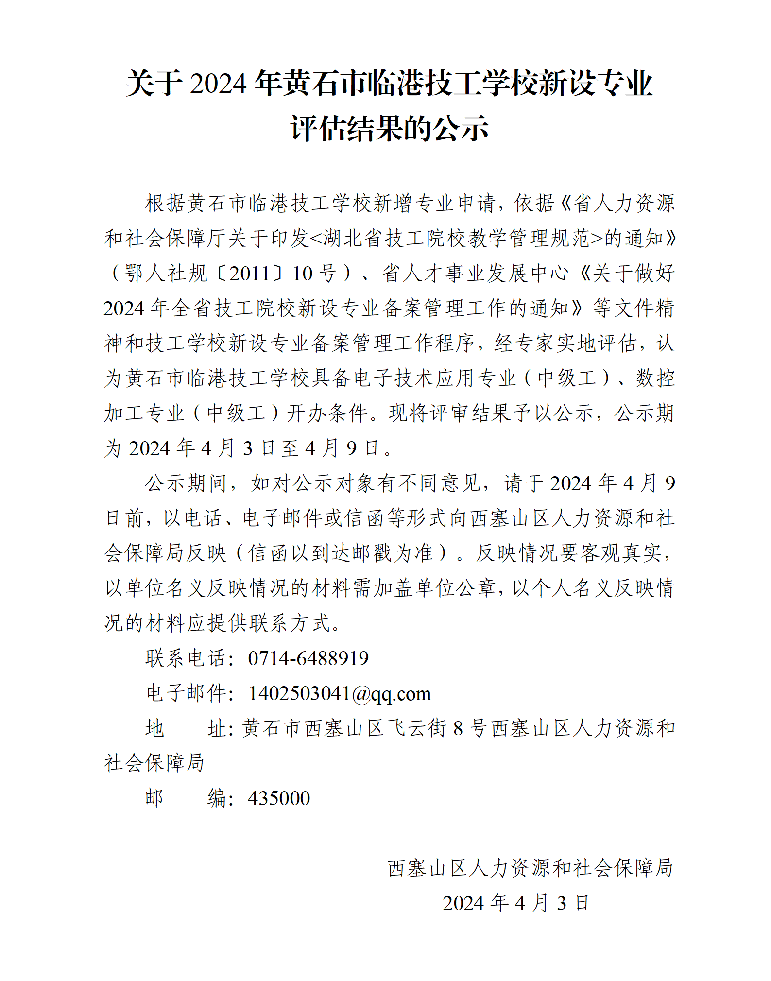关于2024年黄石市临港技工学校新设专业评估结果的公示